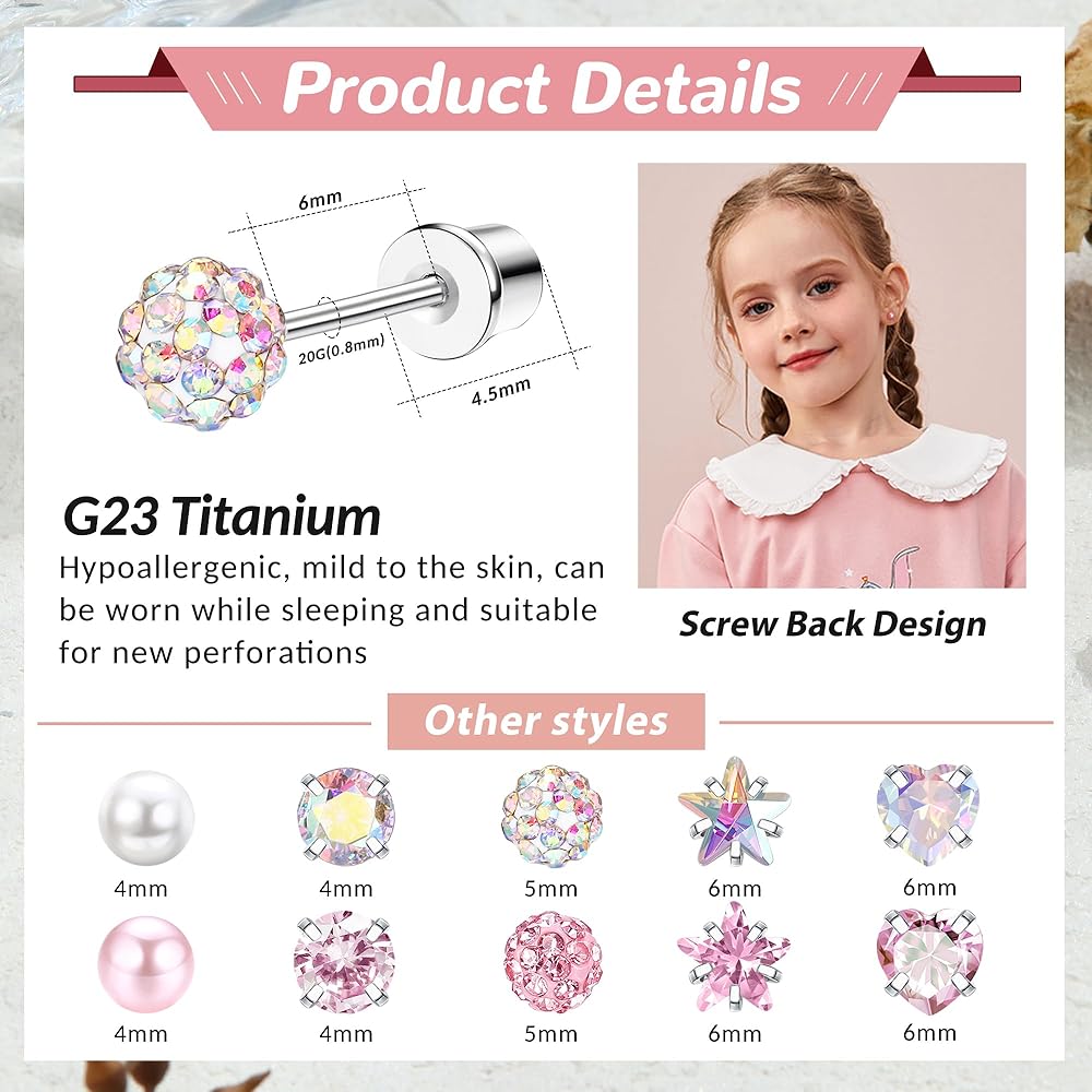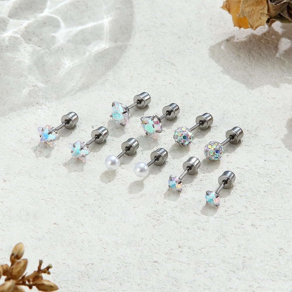 【المقاس】سُمك العمود = 20 جم (0.8 مم)، الطول القابل للارتداء = 6 مم. قطر اللؤلؤ = 4 مم، قطر الزر الدائري = 4 مم، قطر الكرة = 5 مم، قطر النجمة = 6 مم، قطر القلب = 6 مم. إنها تتألق بشكل جميل من كل زاوية، وتزين أذنيك.