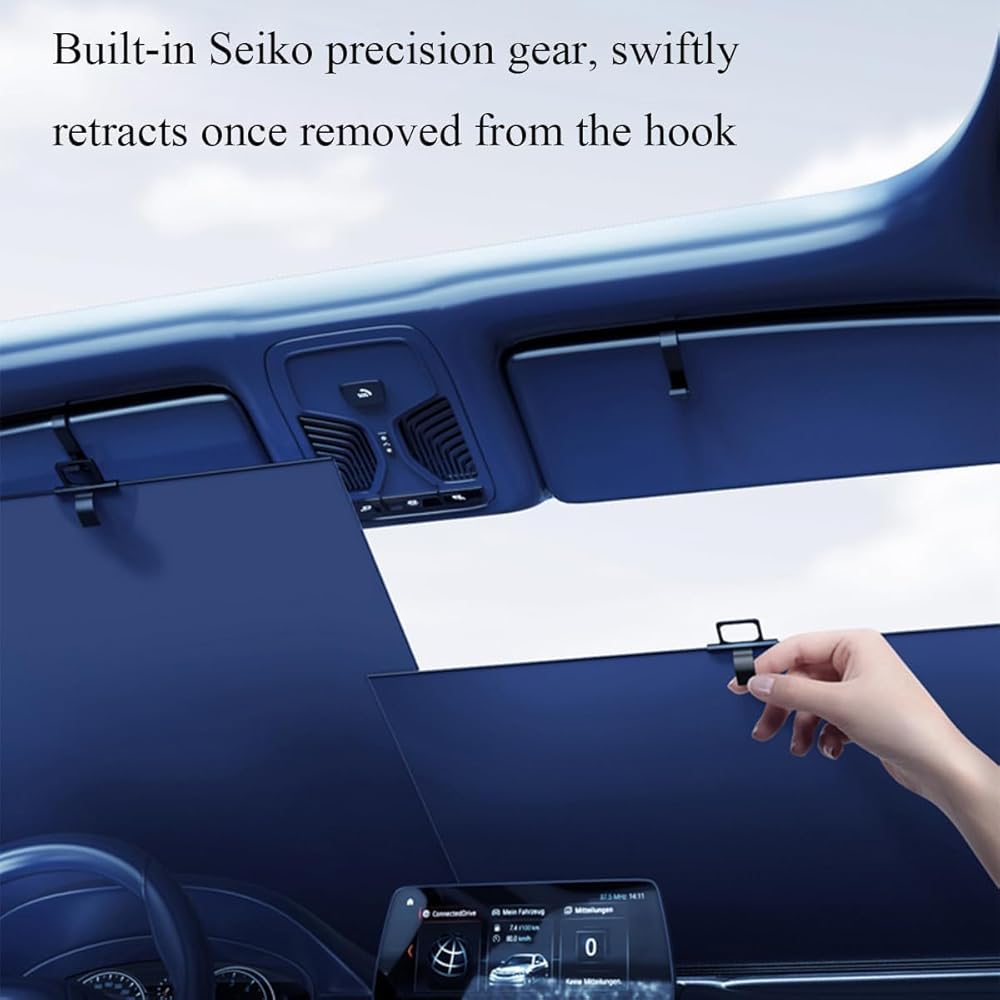 • 【Automatic retraction】This car windshield sunshade adopts built-in Seiko precision gears, which can be quickly retracted after being removed from the hook. This car sunshade has been tested 50,000 times to ensure smooth rotation and enhanced durability. Due to its time and space efficiency, it is very suitable for windshields of various models, such as compact cars, sedans, SUVs, MPVs.
