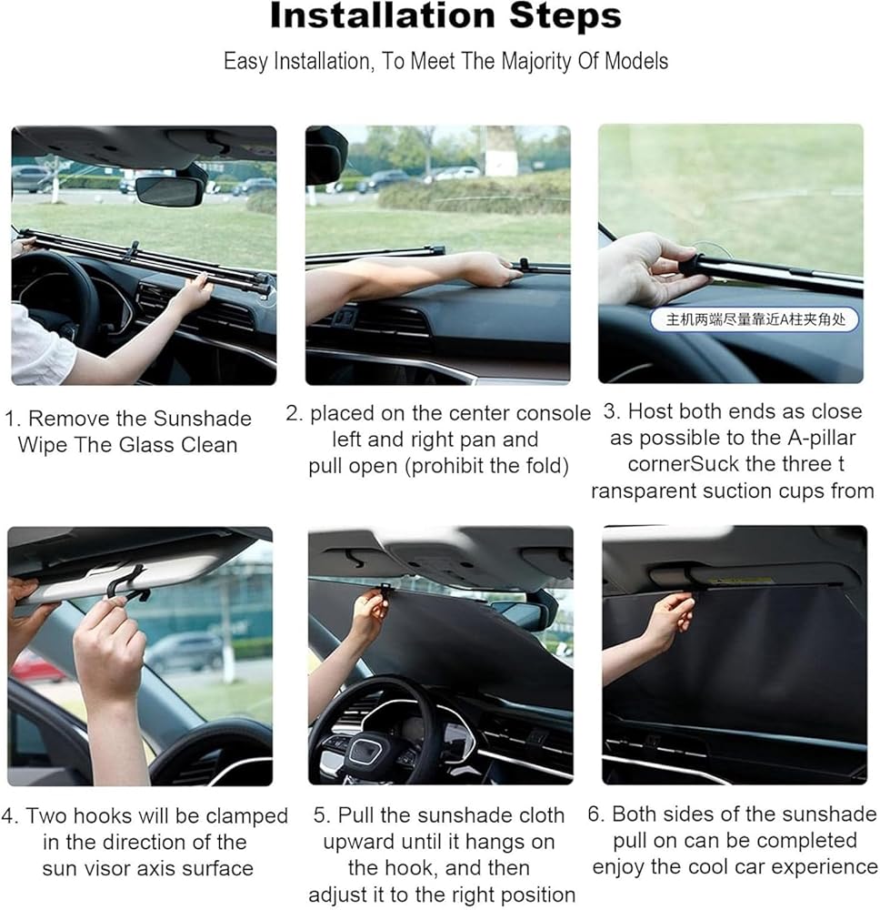 • 【Invisible installation】Unlike other car windshield sunshades, this car sunshade is installed at the bottom of the windshield, which is hidden and direct, avoiding overhanging, eliminating the risk of the sunshade falling off. It does not block the driver's view, thus ensuring safety. Just pull the sunshade up and hook it up every time you use it, which is very convenient.