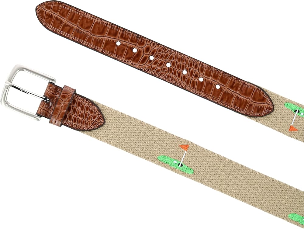 Greg Norman Men's Flag Web Golf BeltFeatures: * Web strap with embroidered "flag on the green" design * Genuine leather tab features 2-tone croc print pattern * Strap has 7 point end holes for ideal fit and feel * SingleA buckle with silver finish * Width: 35mm * Sizes: Fits waists 32" to 44"