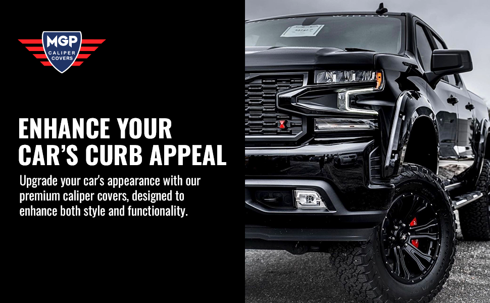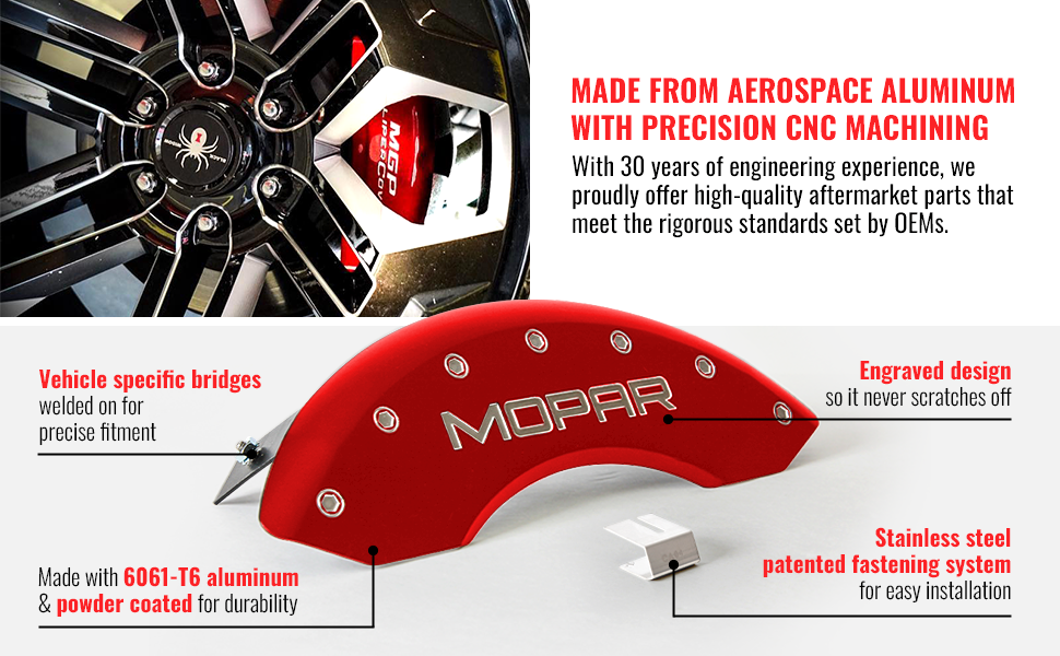 MGP Caliper Covers are manufactured in the USA with T-6061 aerospace grade aluminum, TIG welded for strength, powder-coated for durability and includes a patented stainless steel fastening system. Each set is engineered specifically for the brake caliper to ensure proper fit and finish. No adhesives, tape, or caliper modifications are required. Typical installation time is one hour from start to finish.