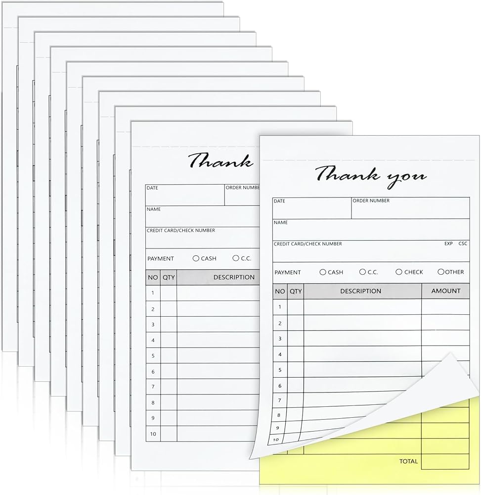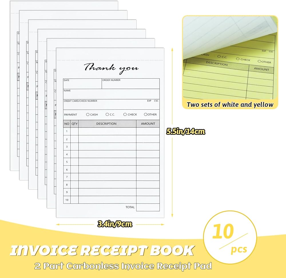 10 عبوات من وسادات الإيصالات المحمولة مقاس 3.4 بوصة × 5.5 بوصة، كتاب إيصالات الشكر، جزءان من فاتورة المبيعات الخالية من الكربون وكتيب طلب المبيعات للشركات الصغيرة، 500 مجموعة بيضاء/أصفر