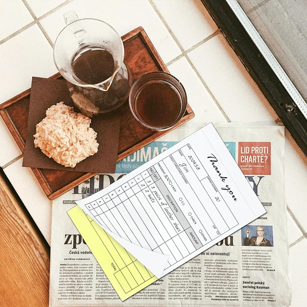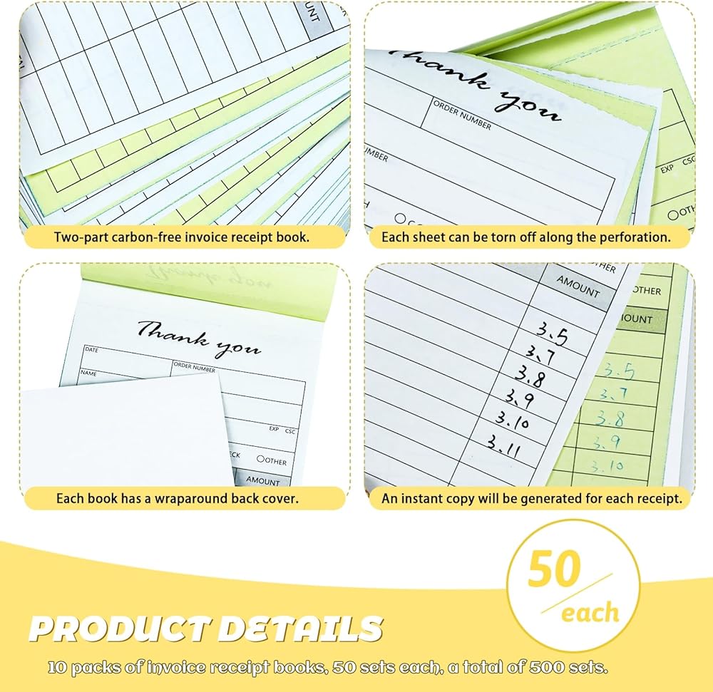 لوحة إيصالات الفواتير الخالية من الكربون مكونة من جزأين: سوف تحصل على 10 عبوات من دفاتر إيصالات الفواتير، 50 مجموعة في كل لوحة، إجمالي 500 مجموعة. يقوم كل إيصال بإنشاء نسخة فورية، مما يسمح لك بالاحتفاظ بواحدة لسجلاتك وتقديم نسخة أخرى إلى عميلك