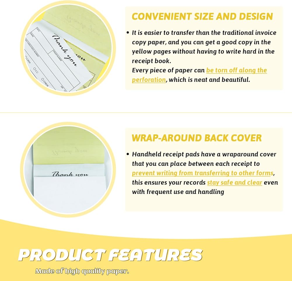 جودة عالية: كتيب الإيصالات مصنوع من ورق عالي الجودة يمكن نقله بسهولة أكبر من ورق فاتورة النسخ التقليدي، لذلك لا تضطر إلى الكتابة بقوة على دفتر الإيصالات والحصول على نسخ رائعة على الصفحات الصفراء. يمكن تمزيق كل قطعة من الورق على طول الثقب، بشكل أنيق وجميل