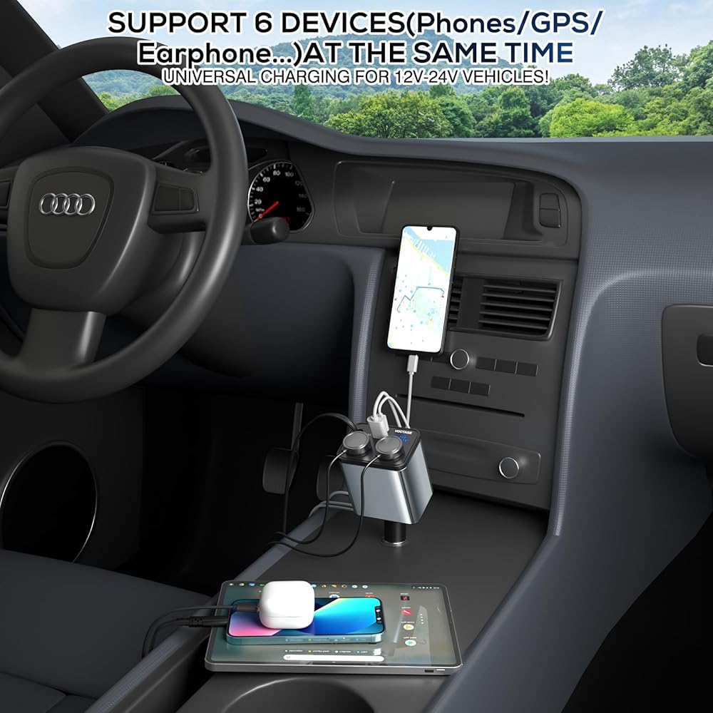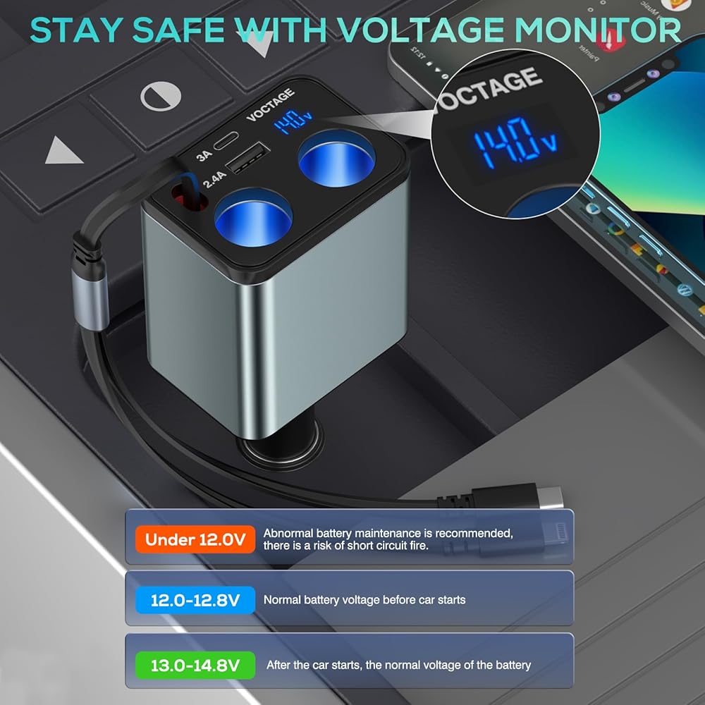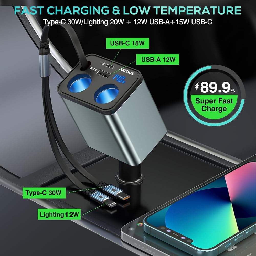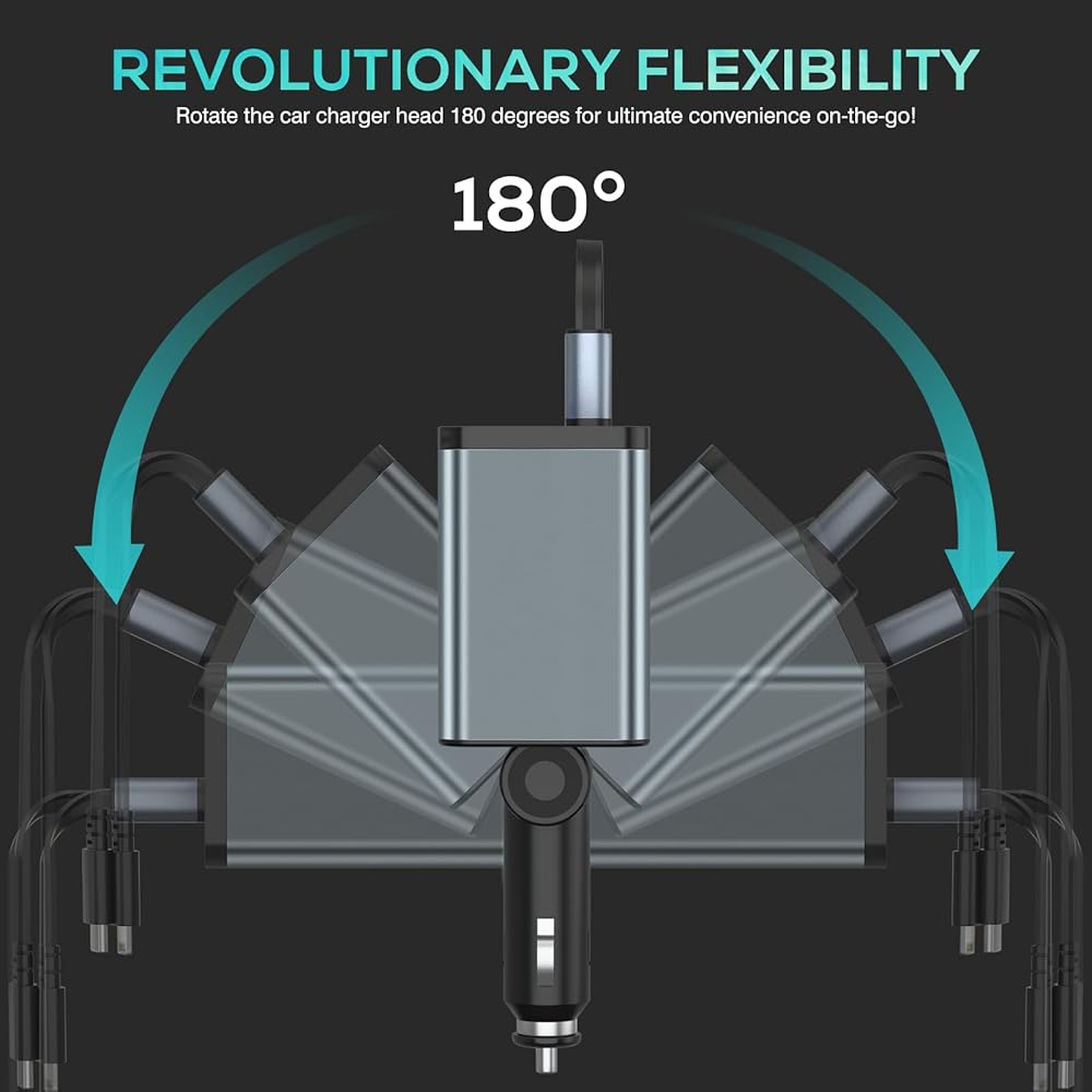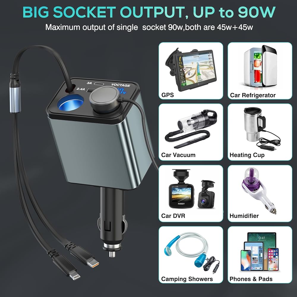 شحن سريع متزامن لستة أجهزة: يصمم شاحن USB ولاعة السجائر هذا سلكًا قابلاً للسحب مع موصلين (الإضاءة والنوع C)، ومنفذين USB (USB A+USB-C) ومقبسين، ويمكنه شحن ما يصل إلى ستة أجهزة بسرعة في وقت واحد مما يجعله مناسبًا بشكل لا يصدق للعائلات والأفراد الذين لديهم أدوات متعددة.