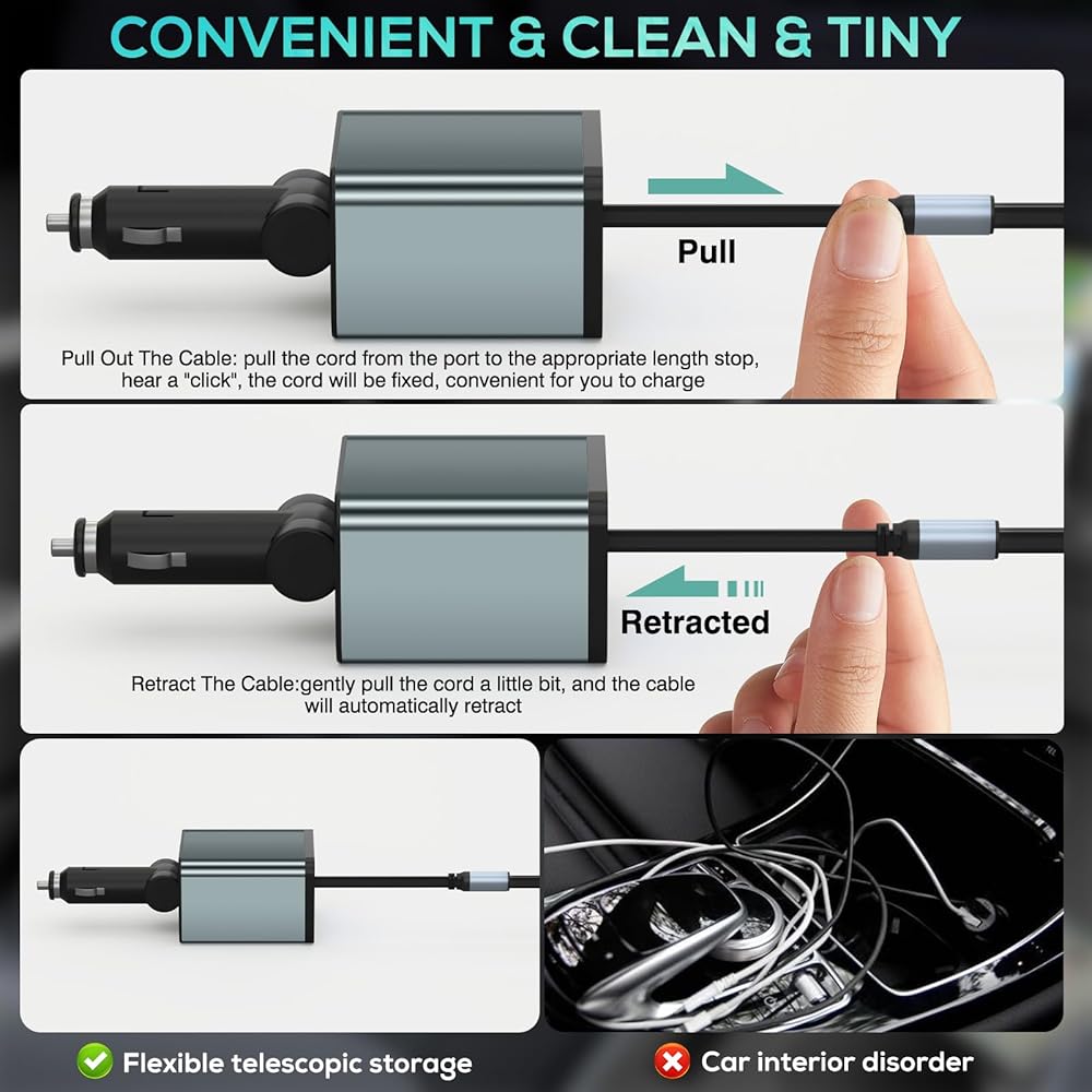 شاحن سيارة قابل للسحب ومتوافق مزدوج الشحن السريع: يتميز بكابل شحن قابل للسحب يتضمن موصلات Lightning وType-C، مما يجعله متوافقًا مع كل من أجهزة iPhone/iPad والهواتف الذكية/الأجهزة من النوع C. يدعم الشحن السريع لجميع الأجهزة. الكابل القابل للسحب طويل بما يكفي (32 بوصة) للوصول إلى جميع المقاعد. يضمن التصميم القابل للسحب سهولة التخزين ويحافظ على نظافة سيارتك وتنظيمها.