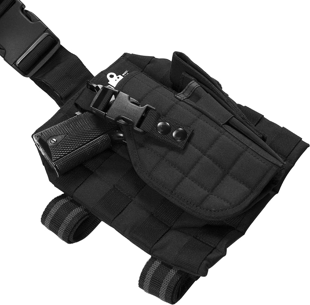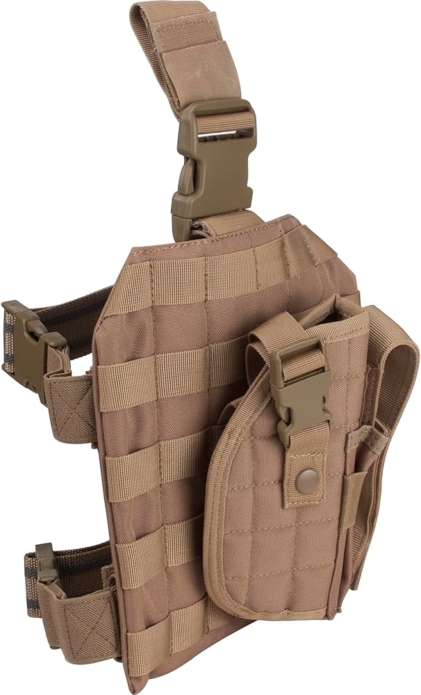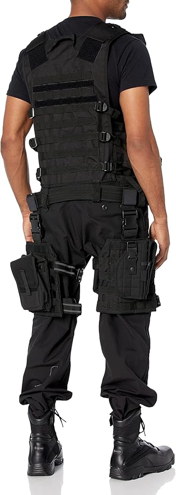 This durable tactical 11 piece vest features a web system that can all be easily re-configured to your preferences. Durable buckles and hook and loop satisfy all operational and tactical needs by keeps tactical essentials organized and close at hand. Fully adjustable straps allow the vest to fit most adult body types. Conveniently, the adjustable shoulder panels, ladder buckles and side straps give you a custom fit. 11 Detachable Pieces Include: (1) Web system radio/phone pouch with buckle and double hook and loop closures; (1) Web system utility pouch with one main zippered compartment and one hook and loop and buckle closures; (2) Web system double section rifle magazine pouches with adjustable retention cords; (1) Web system double section pistol mag/ flashlight pouch with hook and loop closures; (1) Web system utility pouch with dual zipper closures; (1) Heavy duty adjustable belt; (2) Web system adjustable drop leg platform, 1\" modular webbing, side-release buckles, double adjustable leg rig straps with anti-slip rubber stitching; (1) Detachable dump pouch; (1) Detachable right hand draw holster; Specifications: One size fits most; Weight: 5.6 lbs; Length: 20.5 Inches x 27.5 Inches x 28.50 Inches