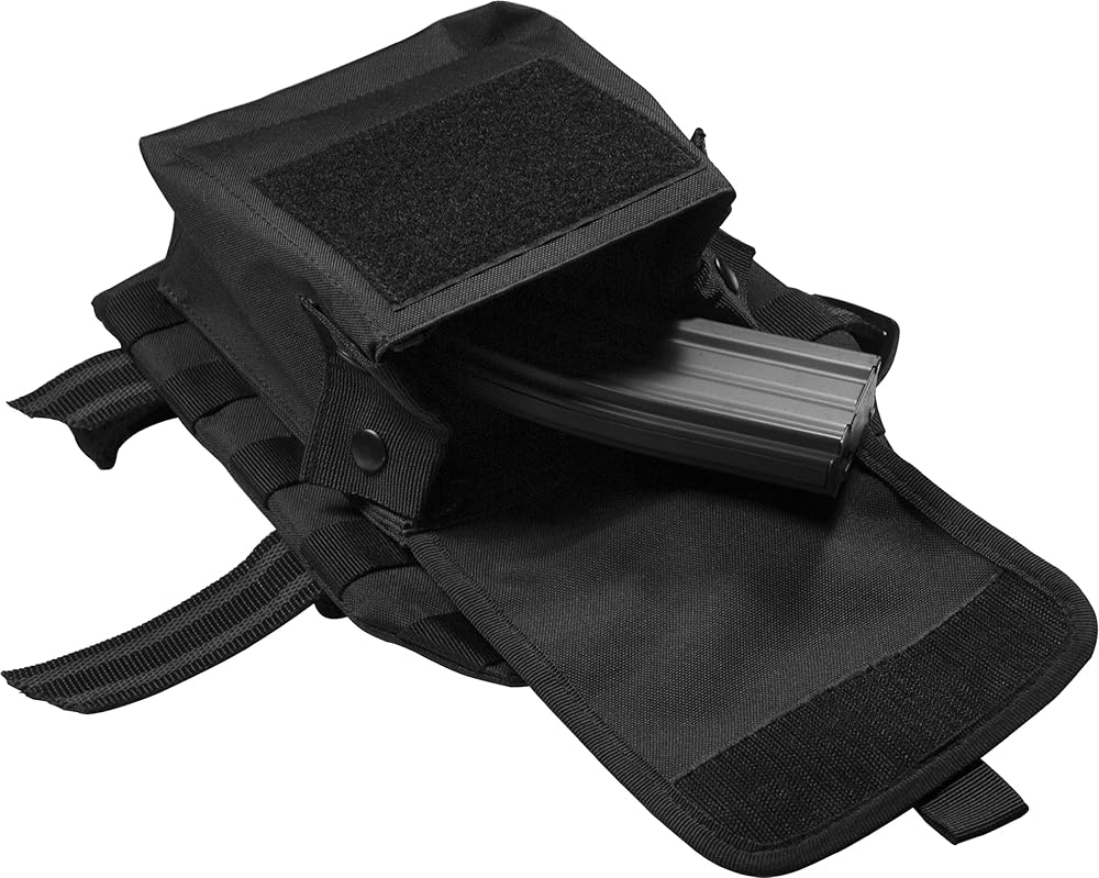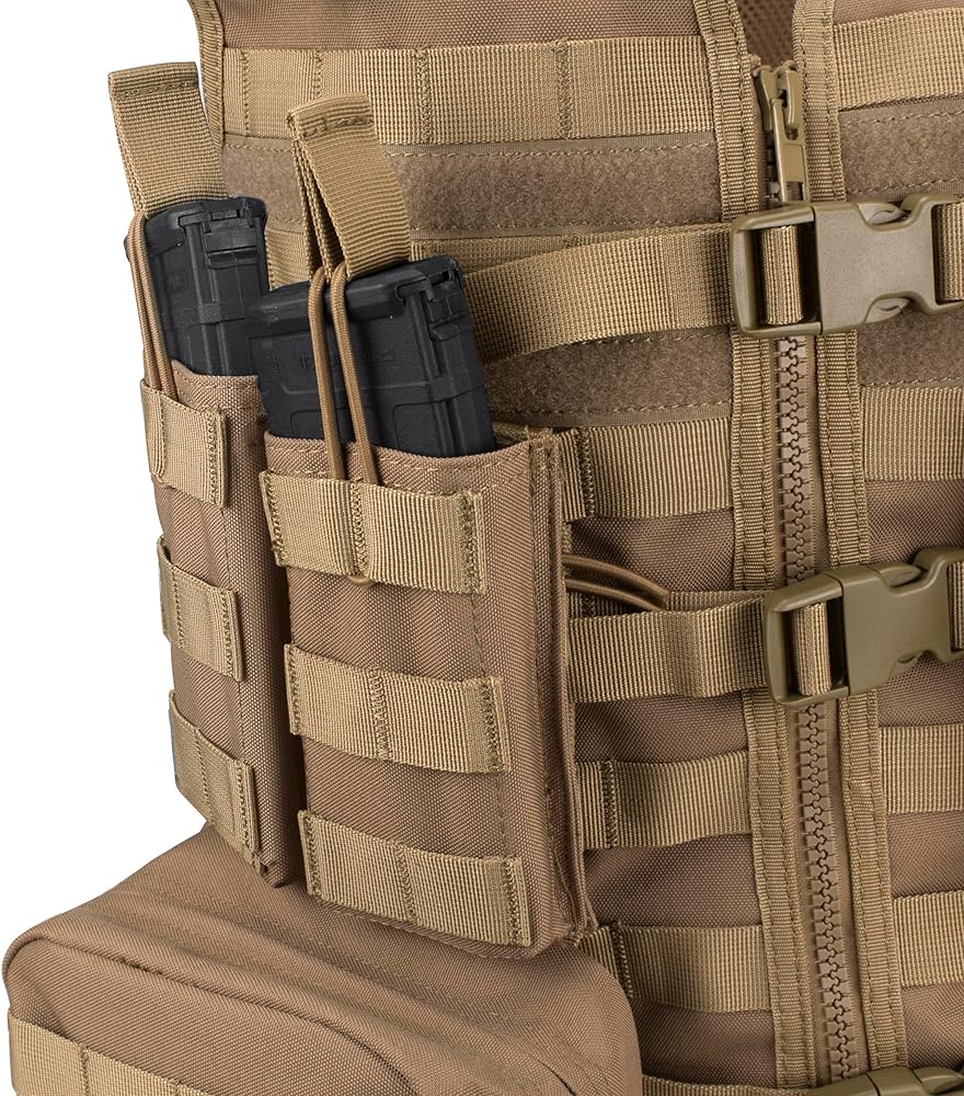 Quick Reload: The magazine pouches can fit standard 30 round magazines, and feature quick-release elastic pull-tab retainers for easy access.