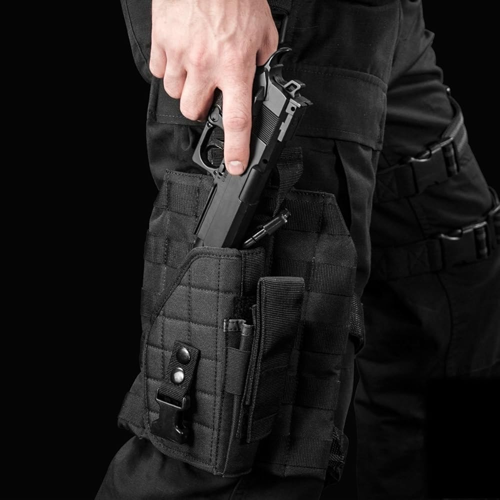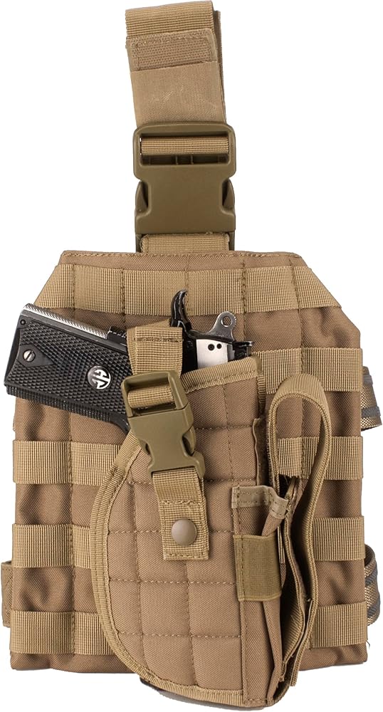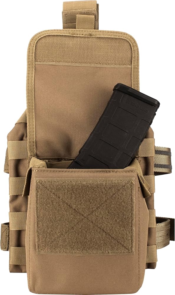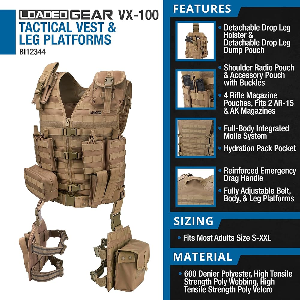 Full Body Platform: The vest comes with 2 uility pouches, 2 double section magazine pouches, 2 adjustable drop leg platforms, radio/phone pouch, double section pouch, belt, detachable dump pouch and detachable right hand draw holster.