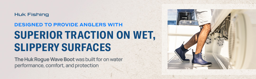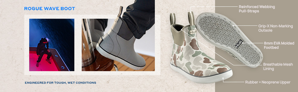 • HUK MENS ROGUE WAVE FISHING BOOT: This durable shoe is engineered for all kinds of nasty conditions. Full neoprene and rubber upper construction provide durability and comfort - bring it on, Mother nature
