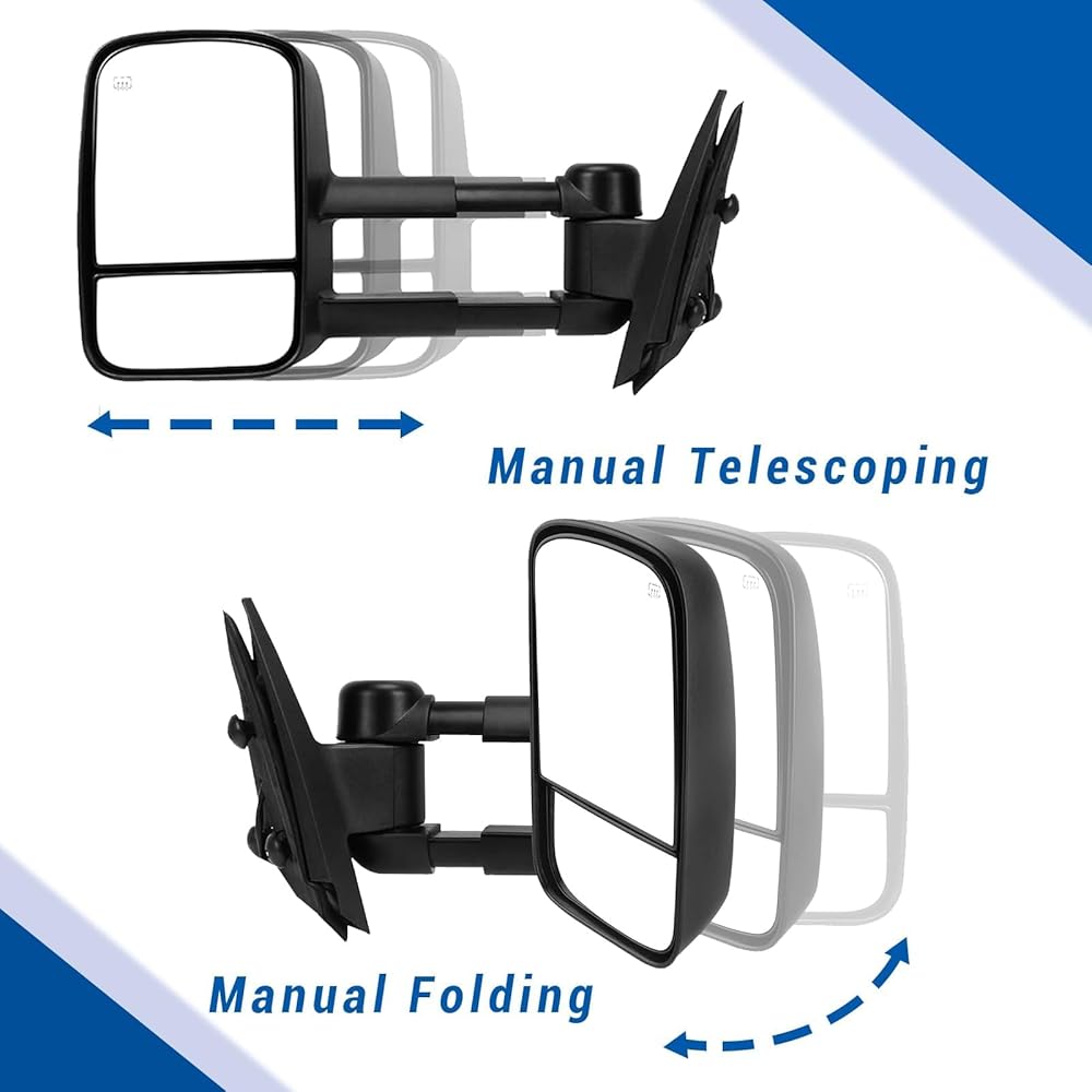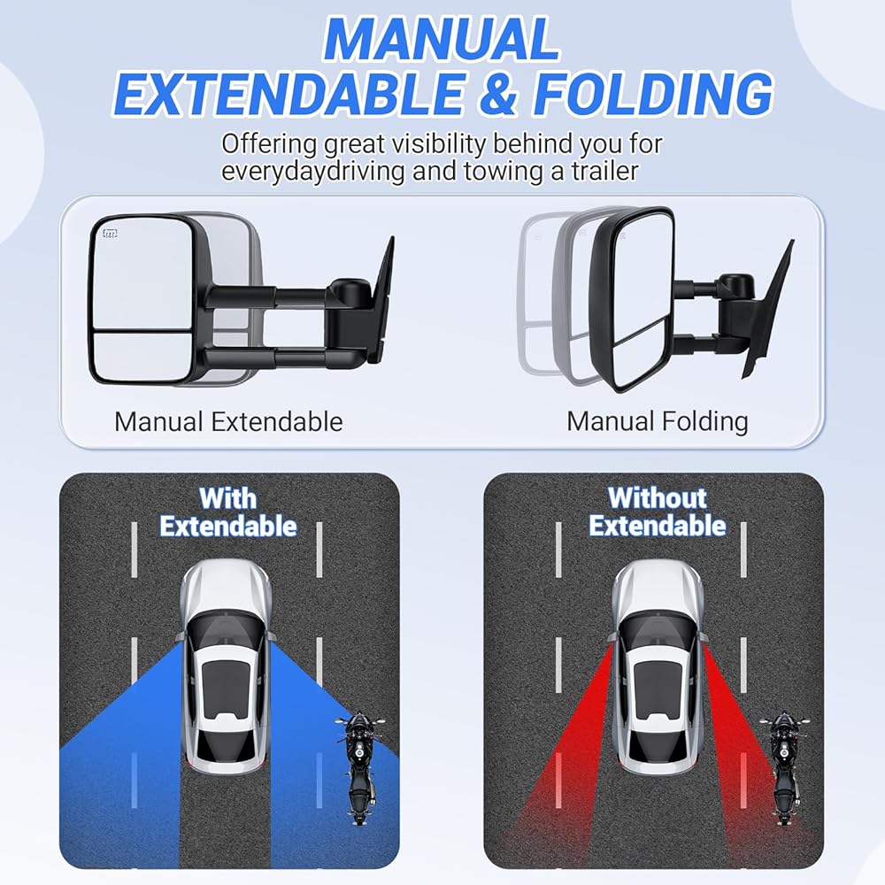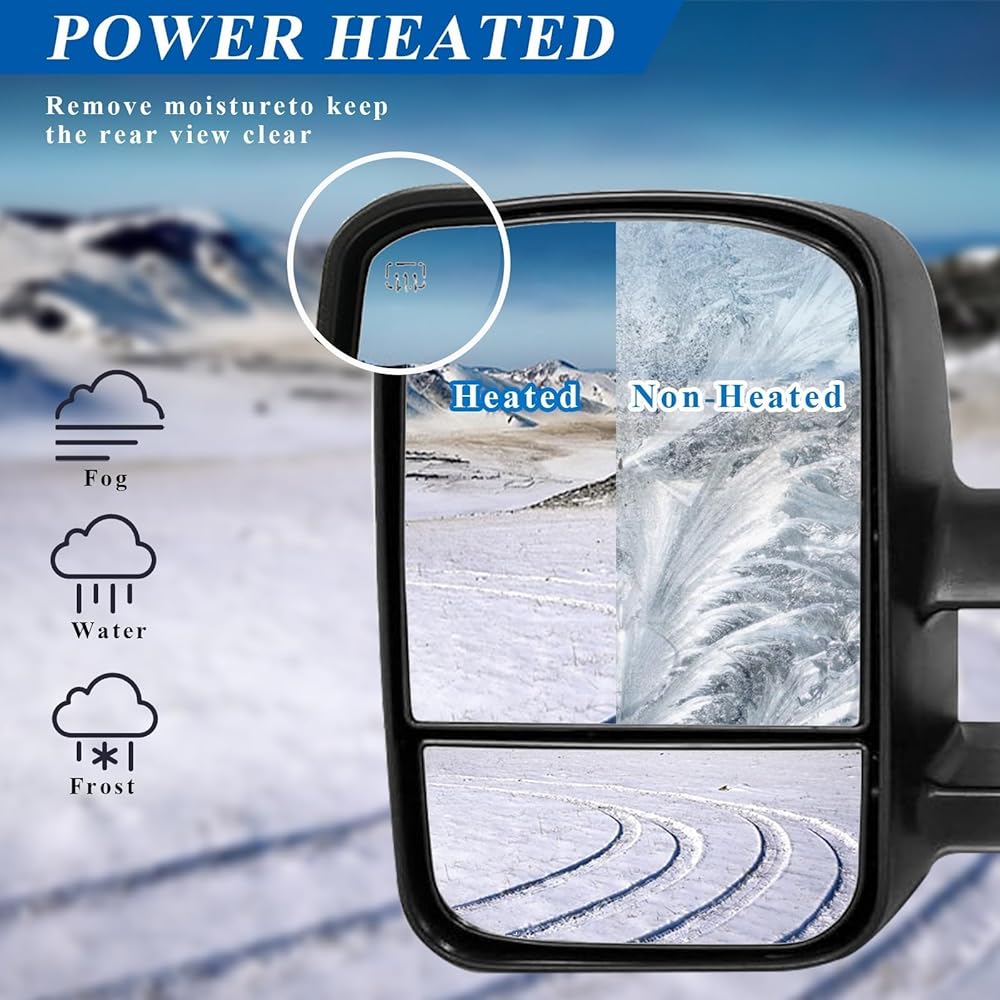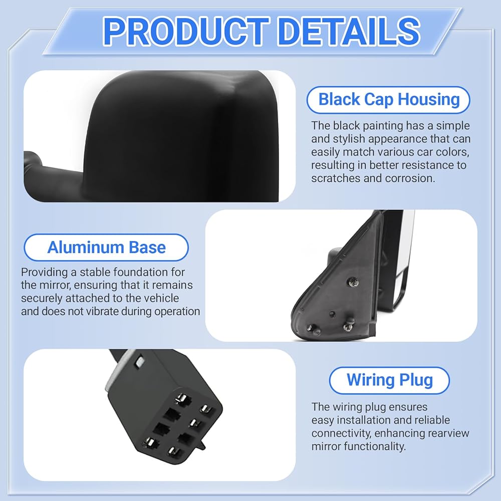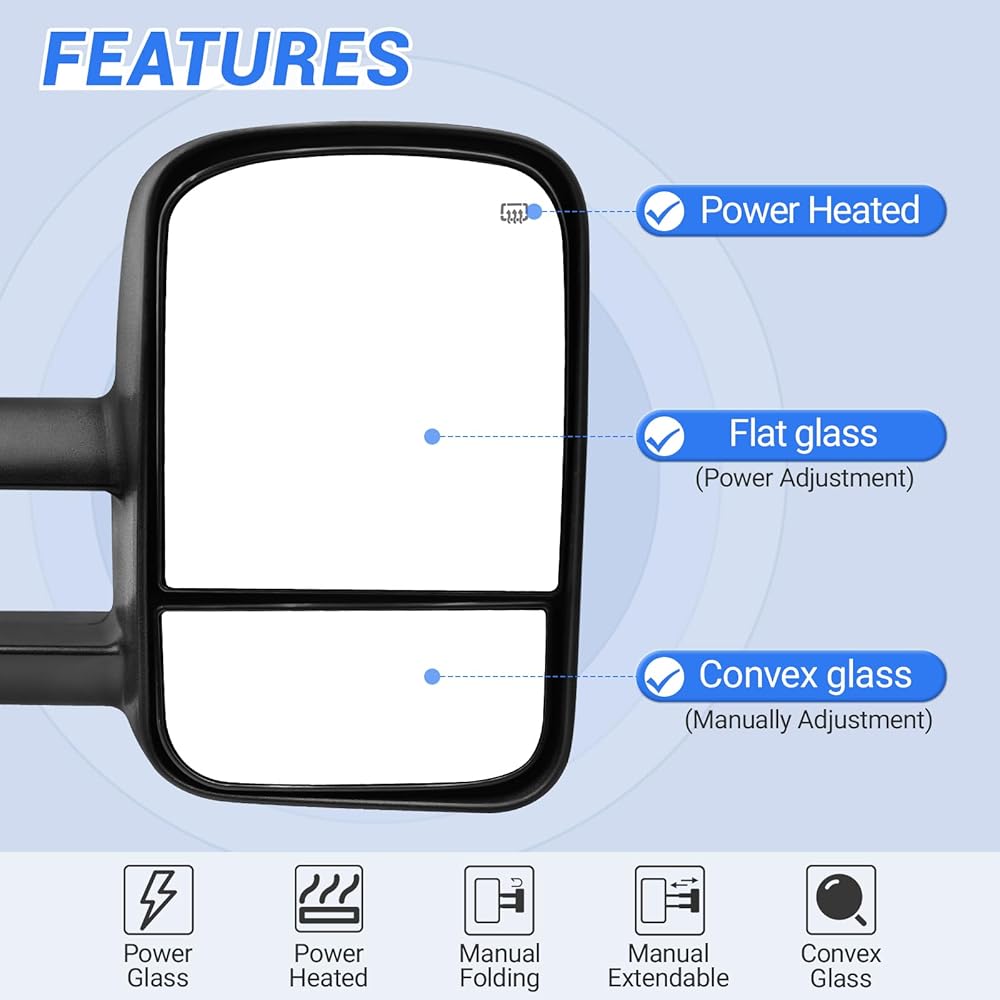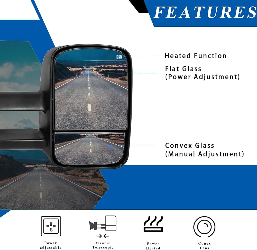 【مرآة مزدوجة】: النظارات المسطحة هي مرايا قابلة للتعديل كهربائيًا، والنظارات المحدبة قابلة للتعديل يدويًا، مما يوفر زاوية أفضل وأوسع للرؤية الخلفية. تحسين الرؤية، وتقليل النقاط العمياء. تحسينات في السلامة على الطرق.