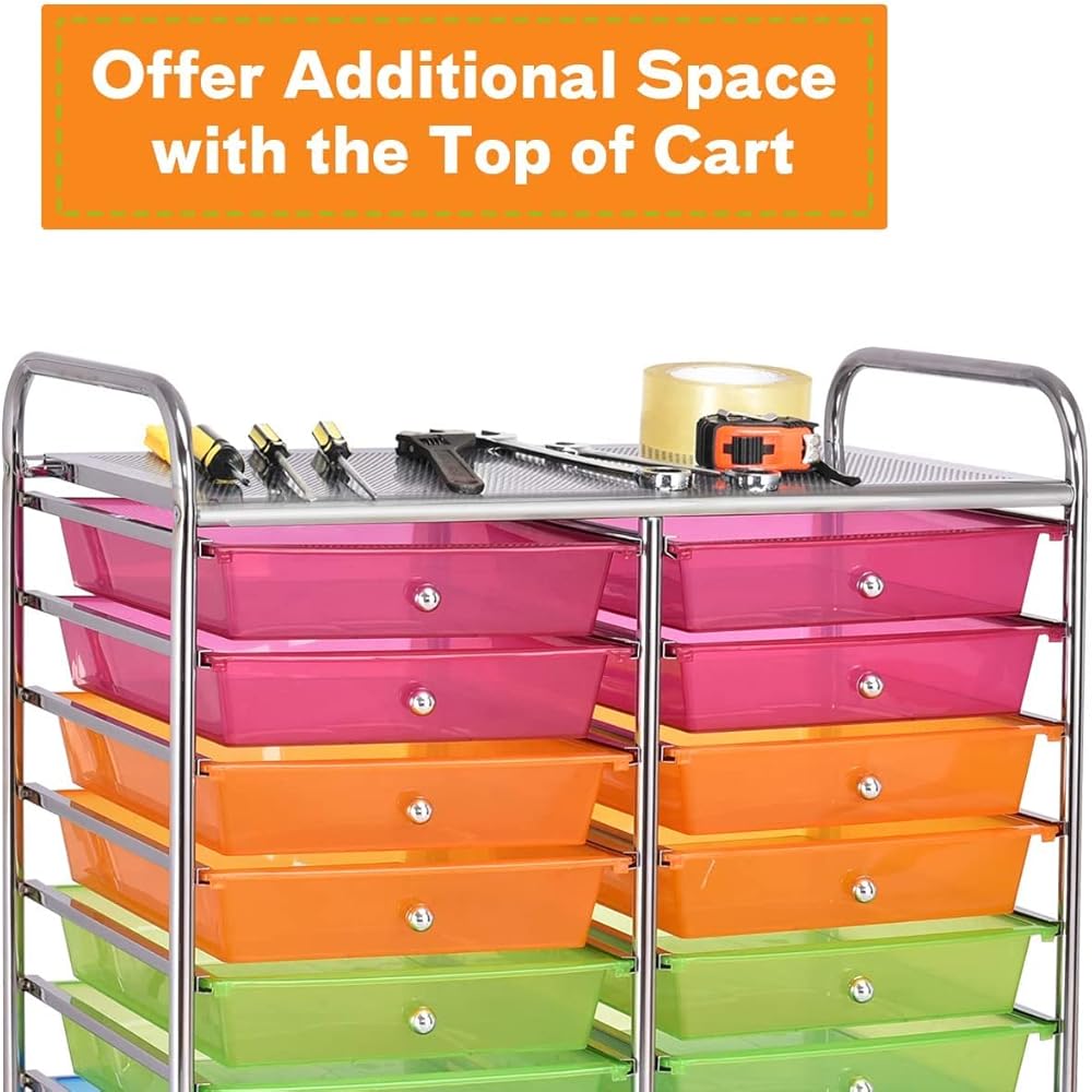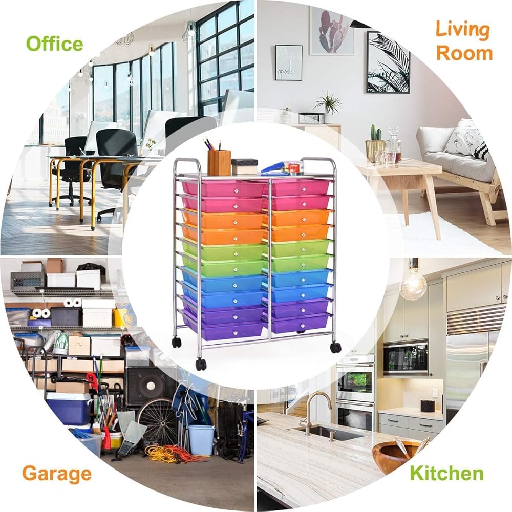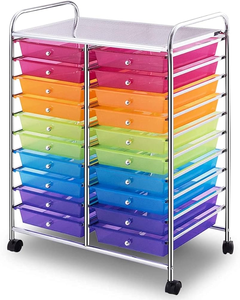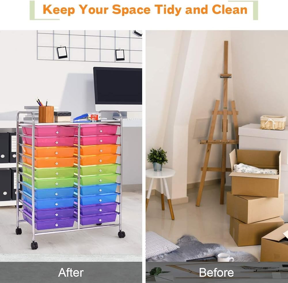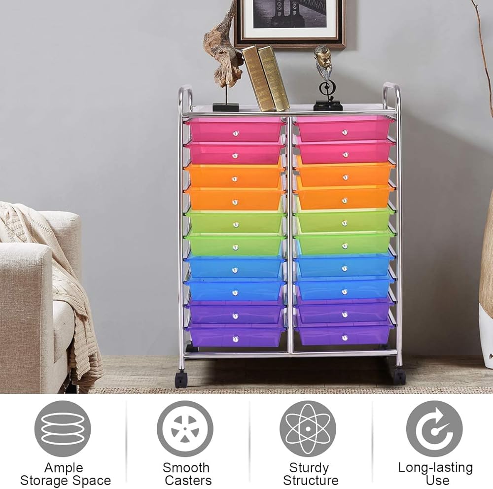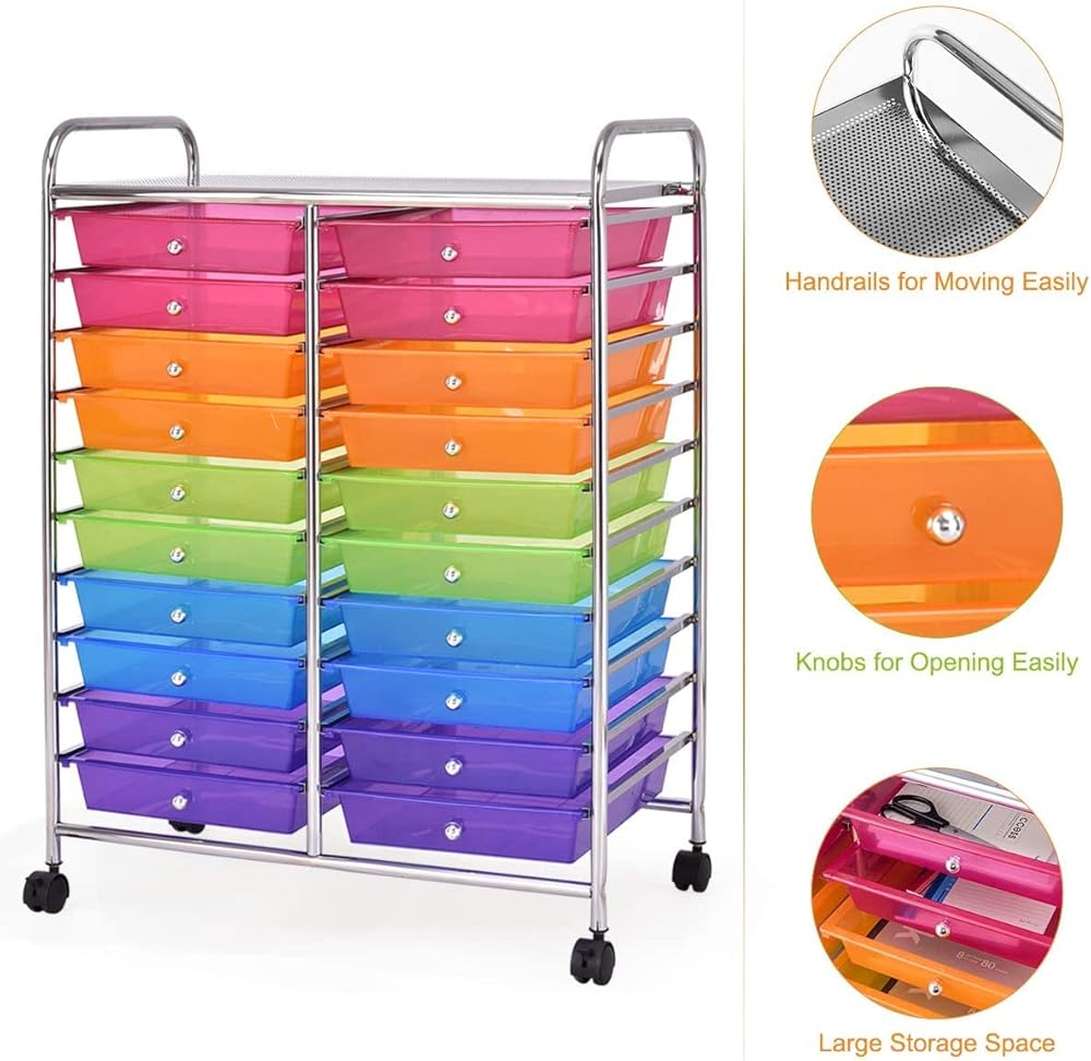 Description:Are you bothered by messy places? This 20 drawers rolling storage cart is the perfect solution for you!If you want to keep your dressing area, bathroom, or children's room organized and neat, choosing our sundries storage cart will be a smart decision. Our storage organizer cart has 20 drawers, which provide enough storage space. It was made of chrome steel framed and plastic drawer organizer, which makes this 20-drawer rolling cart durable enough to serve for a long time. It will be a fancy complement to your office, barber shop, kids room, living room, bathroom, etc.✔️Tip: If your plastic drawers are damaged during transportation or have other problems, please contact our customer service and we will give you satisfactory solutions.We can assure you that:No matter what questions you may have, you can send email to us at any time. The reply will be sent within 1 business day.Features:⭐Environmental, wear-resisting, and anti aging PP material ensures safe use⭐Steel frame and plastic drawers, durable and can serve your for longtime⭐20 drawer storage cart providing plenty of space⭐4 universal wheels(2 with locks) for easy movement and fixation⭐Sturdy steel frame for long lasting performance⭐Two casters feature brakes to stop and fix it to where you want⭐Colorful boxes good for storing items and decorating your living space⭐Ideal storage box for home, office, barber shop, bathroom and schoolSpecifications:Color: Black/Yellow/Clear/Rainbow/MulticolorMaterial: Steel+ PPDrawer Size: 13" x 10" x 2.5" (L x W x H)Overall Size: 25" x 15" x 35" (L x W x H)Diameter of wheel: 1.5"Net Weight: 16 lbs