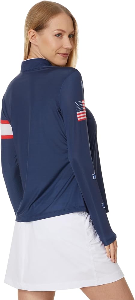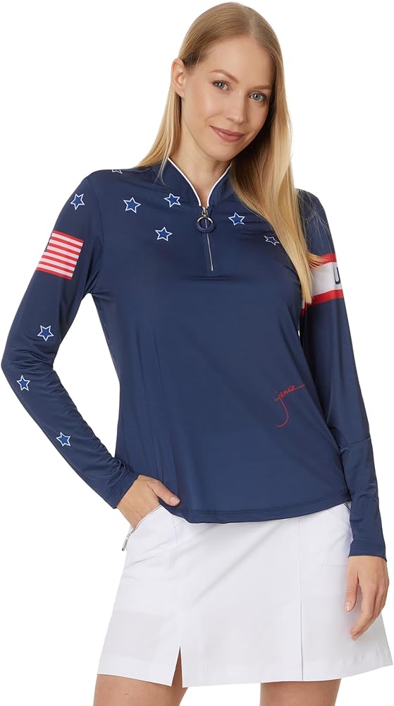 • Long Sleeve Top, Stand Up Collar,Half Body Zipper Placket Piping On Top Of The Collar All Over Print On The Upper Body And Arms, Solid Body Color Upf 50