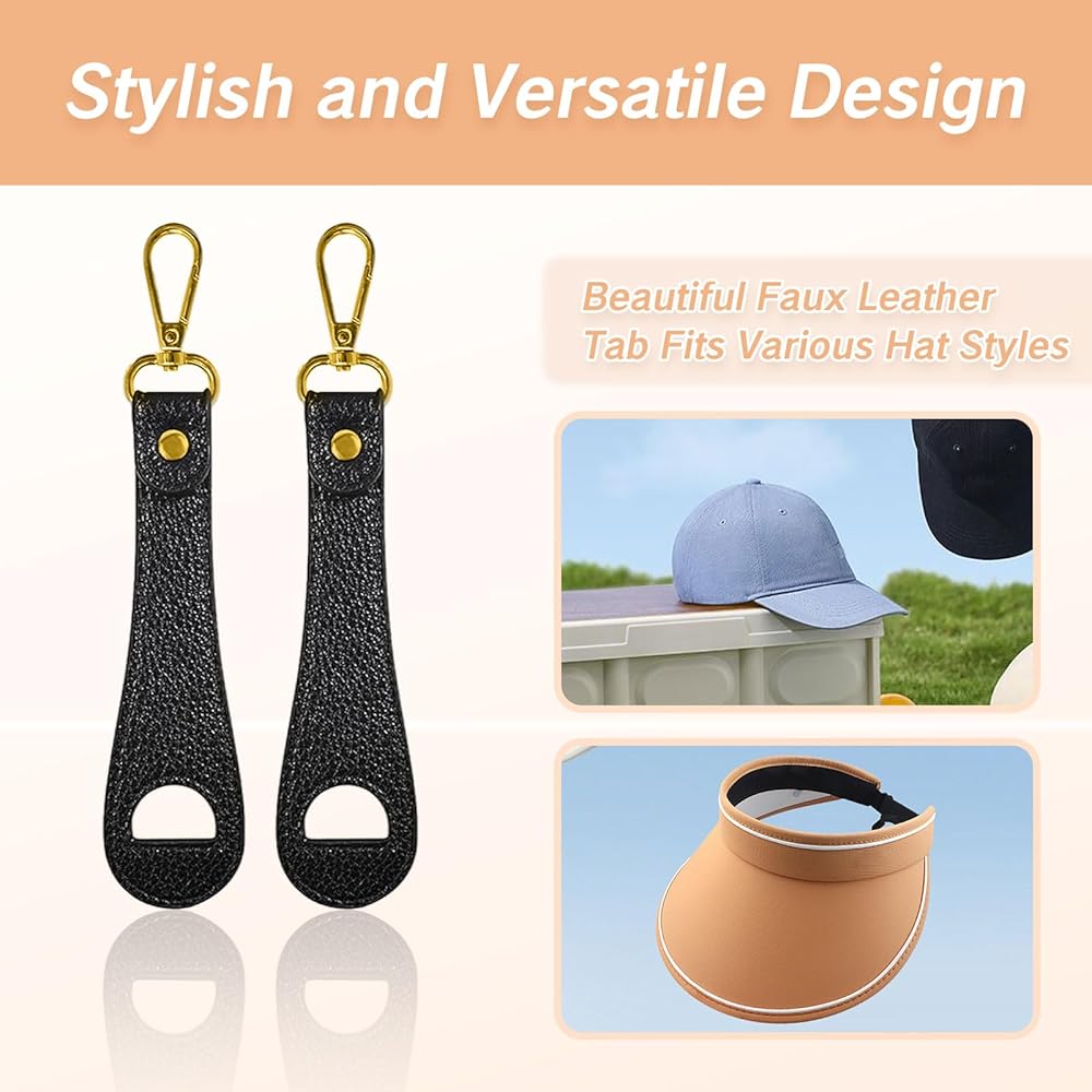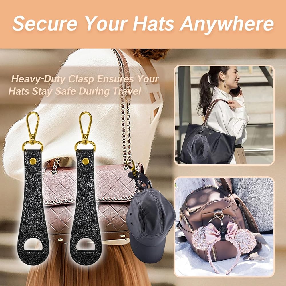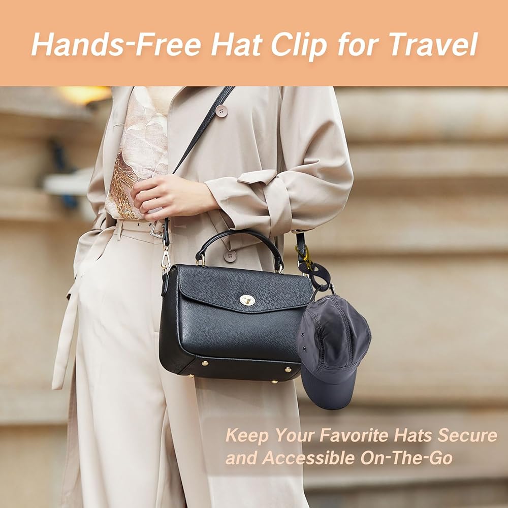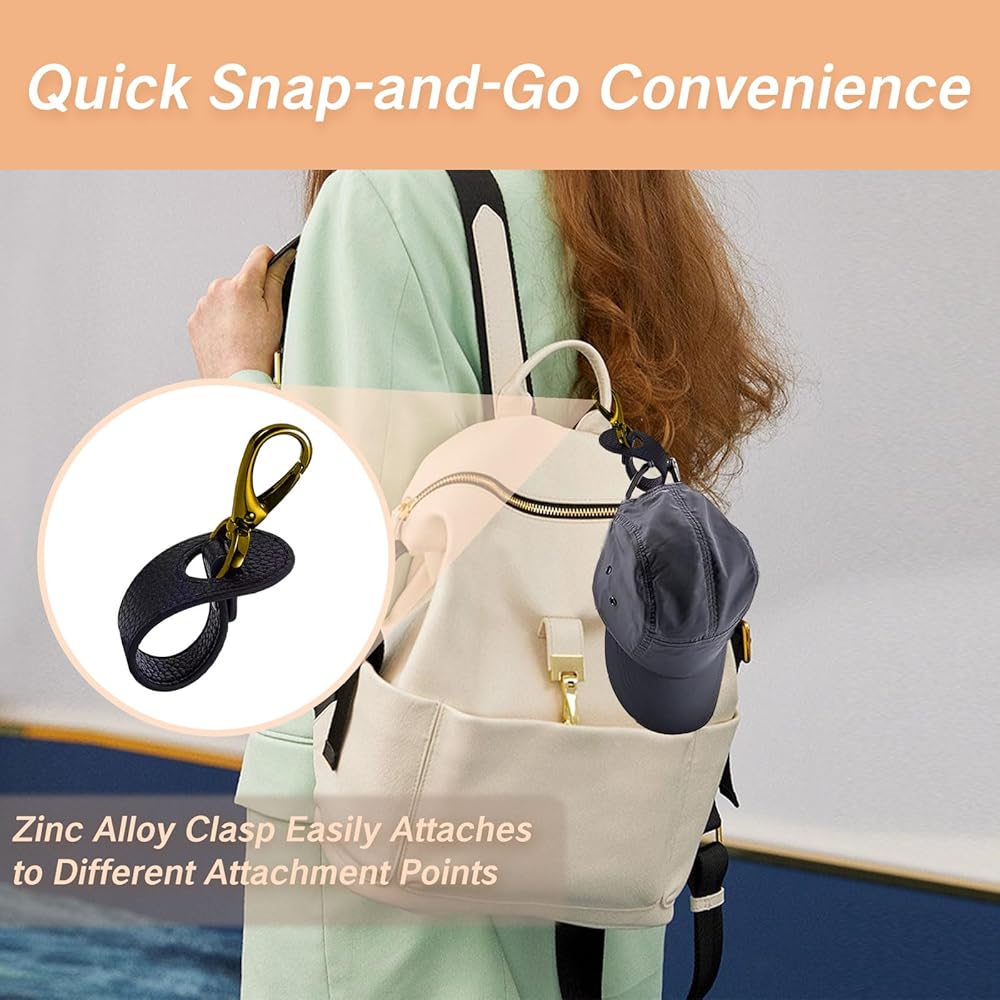 Our magnetic hat clip is a smart and versatile solution for travelers on the go. Whether you're exploring new destinations or running errands around town, simply clip your favorite hat to your backpack and have it ready to wear for added style and comfort wherever you roam.Made with a beautiful faux leather tab, our hat holder combines style with durability. Suitable for a wide range of hat styles and sizes, the soft yet sturdy faux leather tab securely holds your hat in place with its heavy-duty clasp, ensuring reliable performance wherever your adventures take you.Experience quick and hassle-free hat storage with our magnetic hat clip. The zinc alloy clasp effortlessly attaches to zippers, cords, and other attachment points, while the adjustable band slides around the back strap for easy wearability in seconds. Say goodbye to cumbersome hat storage and hello to convenience on the go.With our baseball hat holder, you can keep your favorite hat safe and secure while you're on the move. No more worrying about holding onto your hat or losing it in windy conditions. Simply clip it to your bag and enjoy peace of mind knowing that your hat is always within reach.Whether they're embarking on a cross-country road trip or planning a weekend getaway, our magnetic hat clip makes a thoughtful and practical present for travelers and outdoor enthusiasts alike. Compatible with a variety of bags and suitable for all hat styles, it's the ultimate accessory for those who love to explore the world around them.