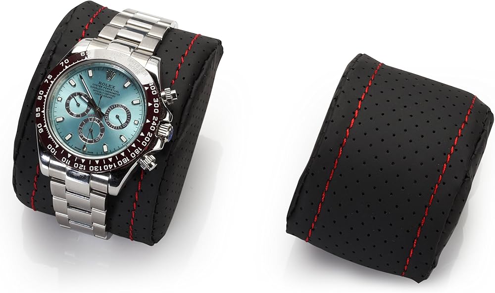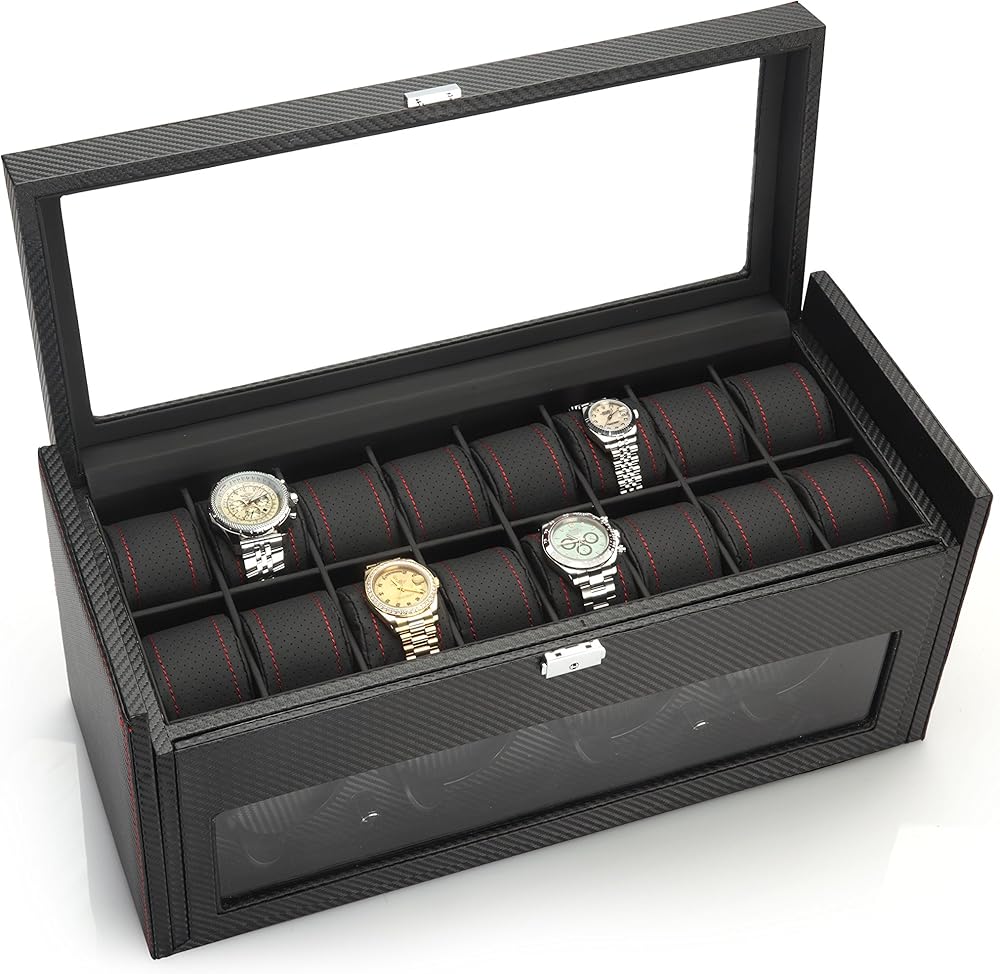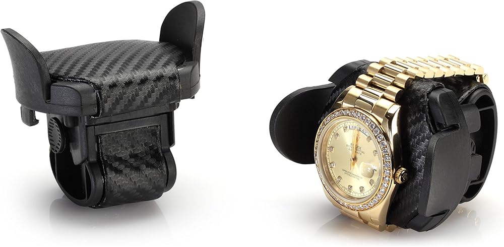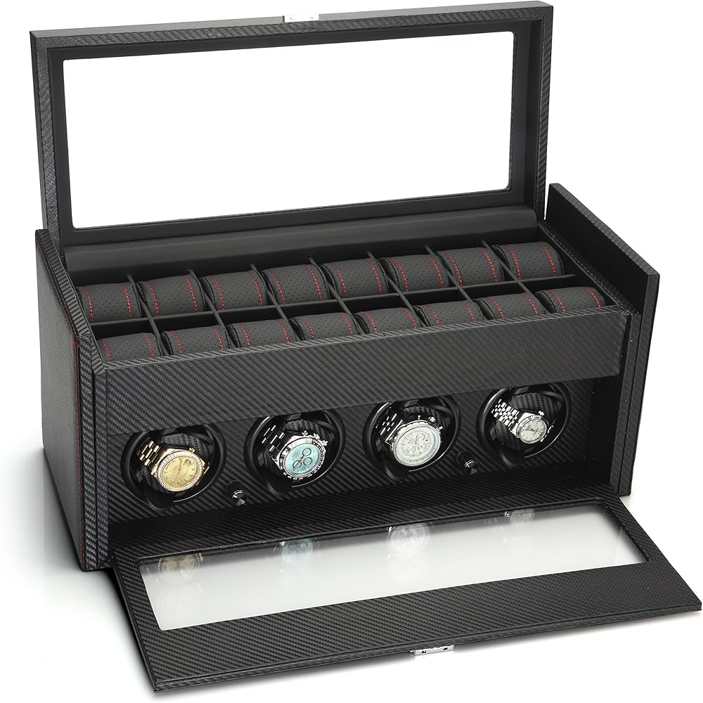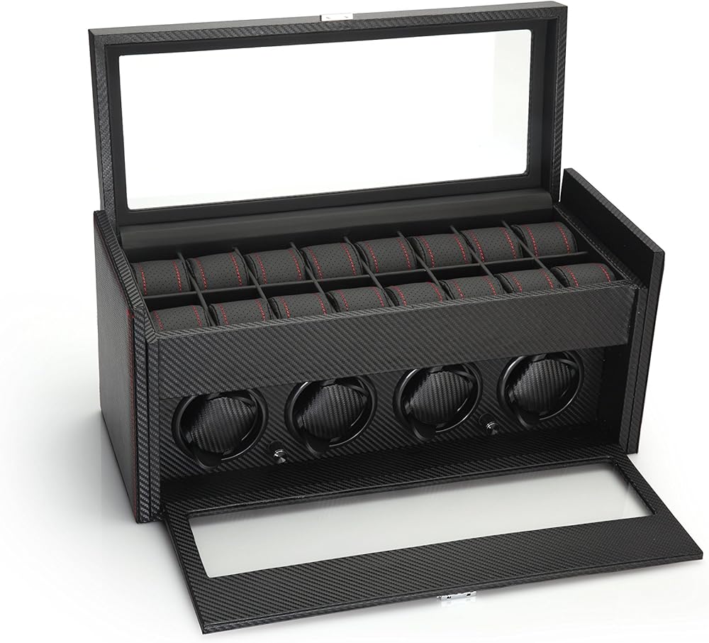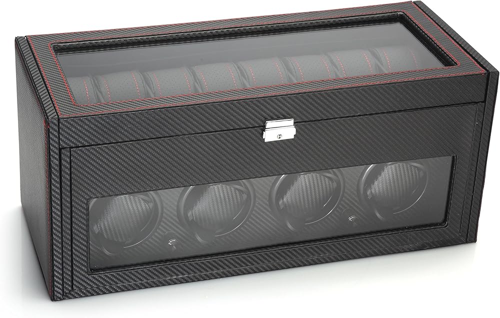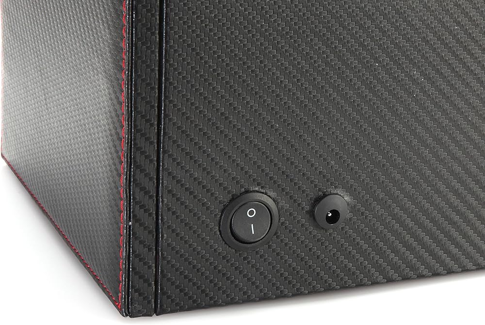 The Modena series watch winder by Diplomat is a racing inspired line of luxury watch winders which is guaranteed to thrill any watch and car enthusiast. The Modena series features an exotic carbon fiber pattern exterior with rich red accents. The interior is also lined with carbon fiber patterns as well. In the top storage compartment you will find a plush black leatherette holders with red accents which stay true to the racing inspiration that this winder is derived from. This unit can wind up to 4 watches at a time and also includes storage for up to 16 watches. The holder used in the winder has a spring loaded extender which allows you to set the holder to the exact size that your watch needs. When fully compressed, the holder is 6.75in in diameter and when fully extended, the holder is 8.25in in diameter. The watch holder in the winder section can accommodate a watch face as large as 68mm wide. In the top storage compartment, the watch holder inserts are very soft and can also be compressed to accommodate for different sized wrists as well. These holders can be compressed to as small as 3.5in diameter to 8in when at full size. Each compartment measures 53mm wide x 85mm long. Although the compartment is 53mm wide, you can still insert a larger faced watch depending on the size of the watch next to it. This watch winder features 4 programmed settings which allow you to rotate your watch at a designated number of turns per day (TPD) and rotation direction, which makes this winder effective on 98% of all watches. Setting No1 rotates in a clockwise rotation for 1 minute, then rests for 20 minutes, then repeats (650TPD). Setting No2 rotates in a counter-clockwise rotation for 2 minutes, then rests for 28 minutes, then repeats (900TPD). Setting No3 first rotates counter-clockwise for 3 minutes then rests for 27 minutes, then rotates clockwise for 3 minutes and rests for 27 minutes, then repeats (1350TPD). Setting No4 first rotates clockwise for 10 minutes, then 10 minutes counter-clockwise, repeating this program for 1 hour, then rests for 7 hours, then repeats from the beginning (1800TPD). This unit is powered by Japanese Mabuchi motors. All Diplomat watch winders have a 1 year warranty. You can power this unit using the supplied 3V AC Adaptor (included. The unit can be locked using the supplied key. The unit measures 20.125in x 8.5in x 8.875in (LxWxH) and weighs 14.2lbs