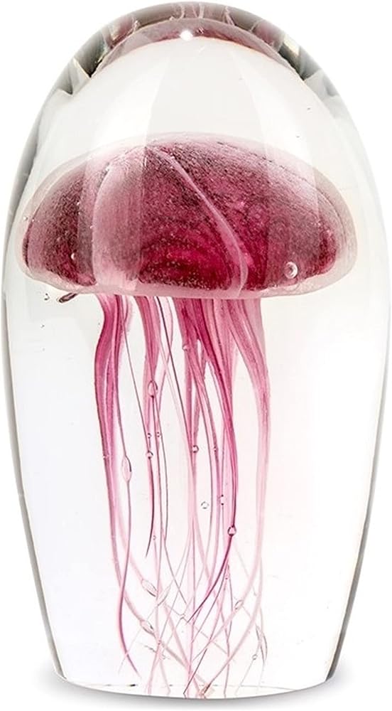 Handcrafted from multiple layers of molten glass, this glass paperweight showcases the free-floating and ethereal qualities of jellyfish. After absorbing light, it continues to captivate with its glow in the dark properties. Pair with a Dynasty Gallery light base to maximize its mystical properties. Product Dimensions: 6.5" H