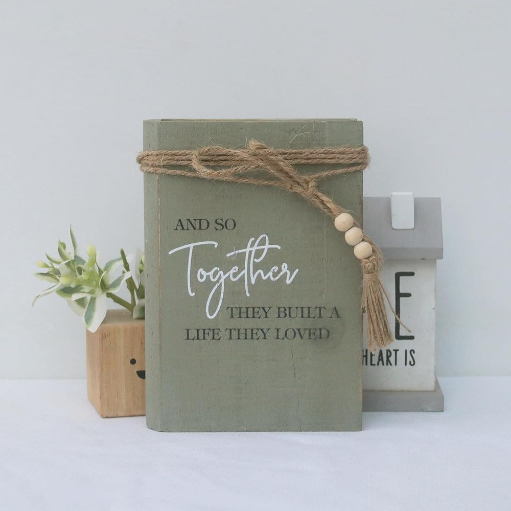 وهكذا قاموا معًا ببناء حياة أحبوها كتابًا مزخرفًا، وكتبًا صناعية مع إكليل من الخرز الخشبي، وديكورات كتب لغرفة المعيشة، ورف الكتب، وطاولة القهوة، وهدايا لمحبي الكتب، مقاس 4.5 بوصة عرض × 6.5 بوصة ارتفاع