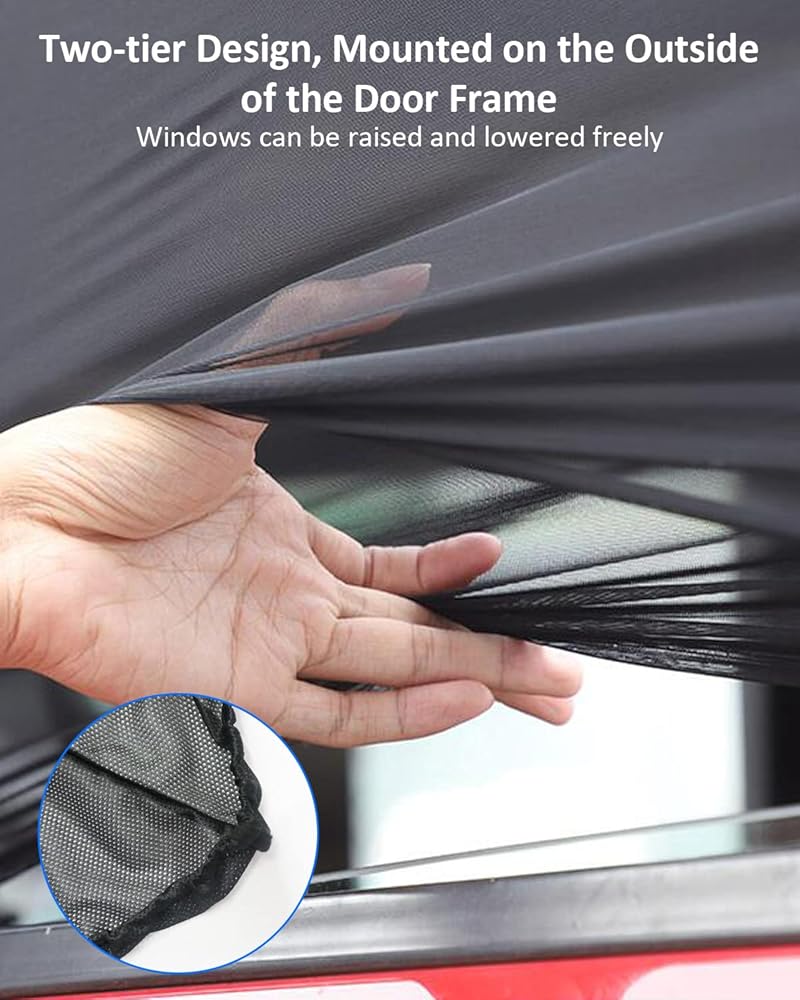 الوظيفة: يمكن للواقي من الشمس المرن أن يمنع الأطفال من التعرض لحروق الشمس في السيارة، ويمكنه أيضًا منع الحشرات والبعوض من دخول السيارة؛ عندما تكون الرياح قوية جدًا، يمكن لشاشة النافذة أن تمنع بعض الرمال والأوراق من دخول السيارة، مما يحافظ على نظافة السيارة ومرتبة؛ يمكنها السماح بتدفق الهواء عبر الشبكة، ويمكنك فتح نوافذك ليلاً عند النوم أو التخييم