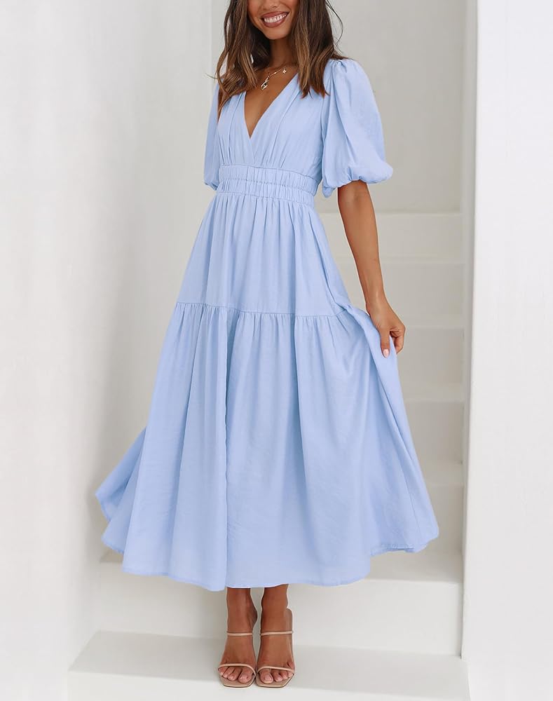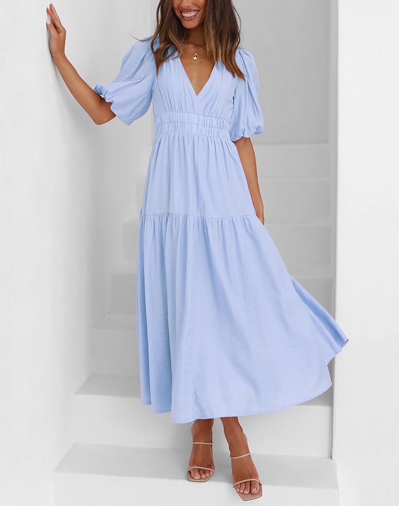 - فستان ماكسي متأرجح للربيع/الصيف بلون سادة عالي الخصر، عطلة/حفلة/زفاف/ضيف/ليلة/كاجوال/شاطئ، فستان متوسط الطول