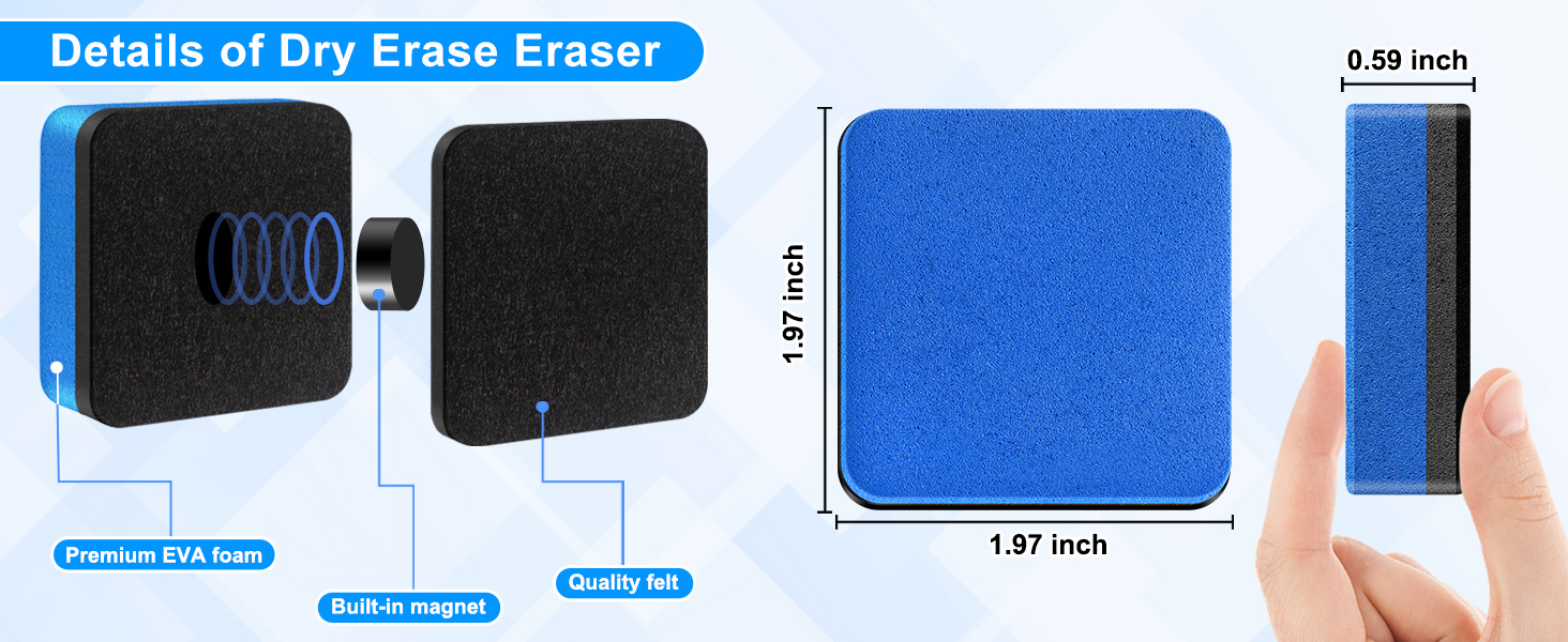 مادة الممحاة الجافة: مصنوعة من مادة EVA عالية الجودة، وجزء سفلي من اللباد عالي الكثافة. صديقة للبيئة، وغير سامة، ولا رائحة، وامتصاص قوي. وأقلام مسح سهلة التنظيف على الزجاج أو السبورة البيضاء.