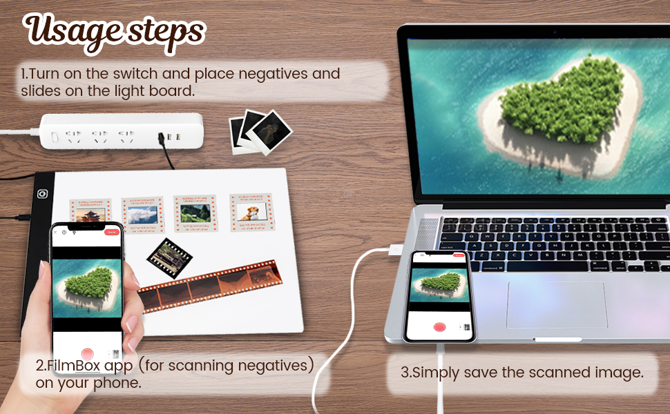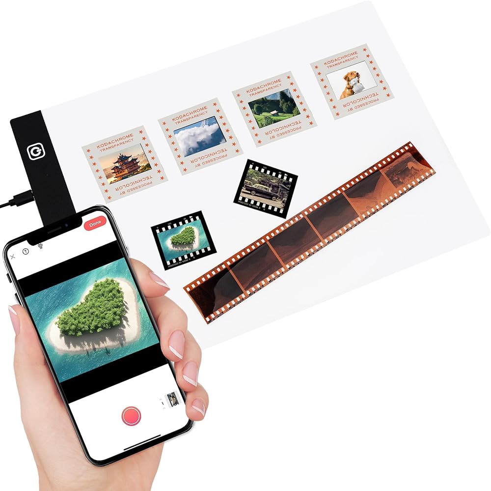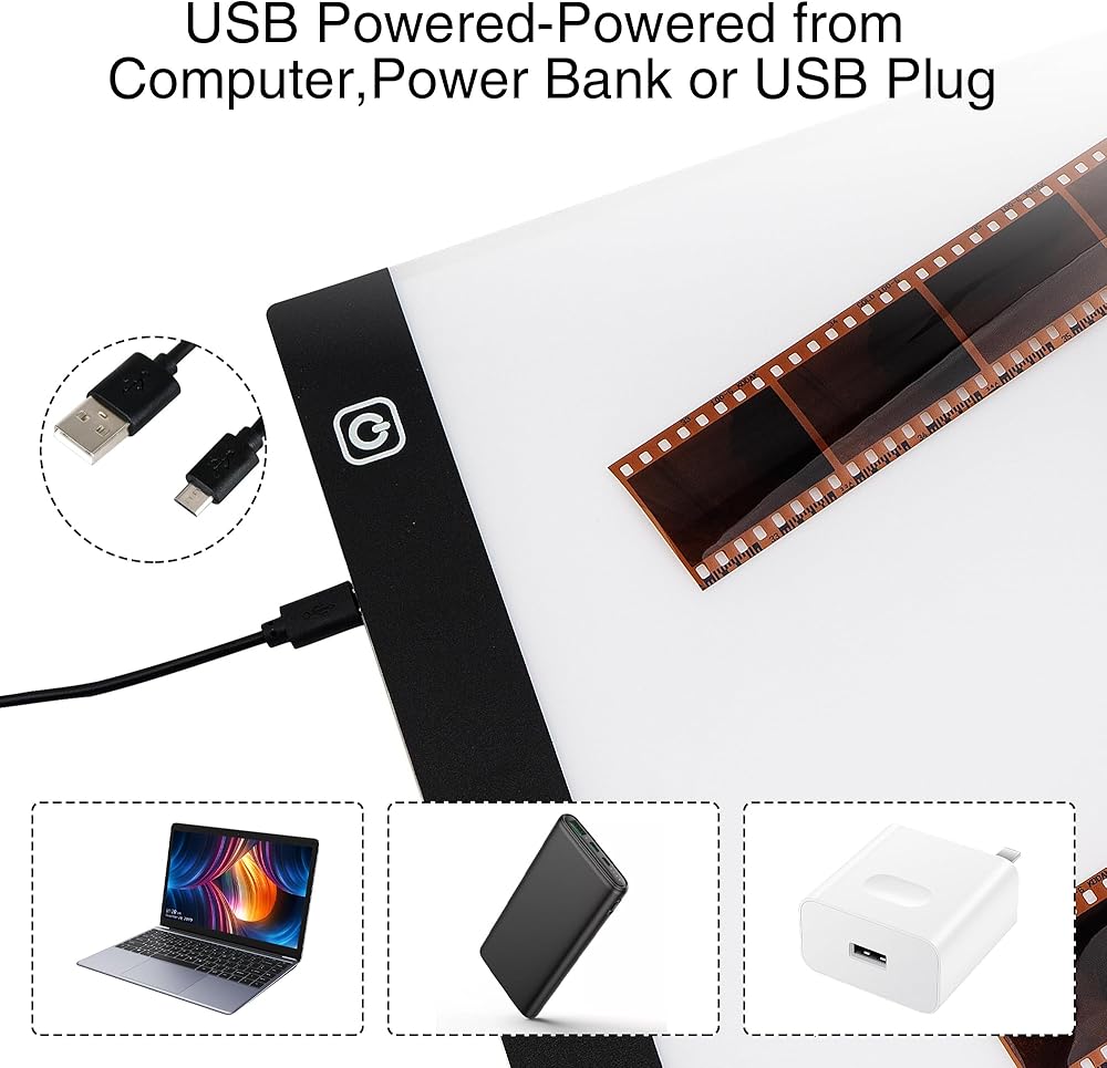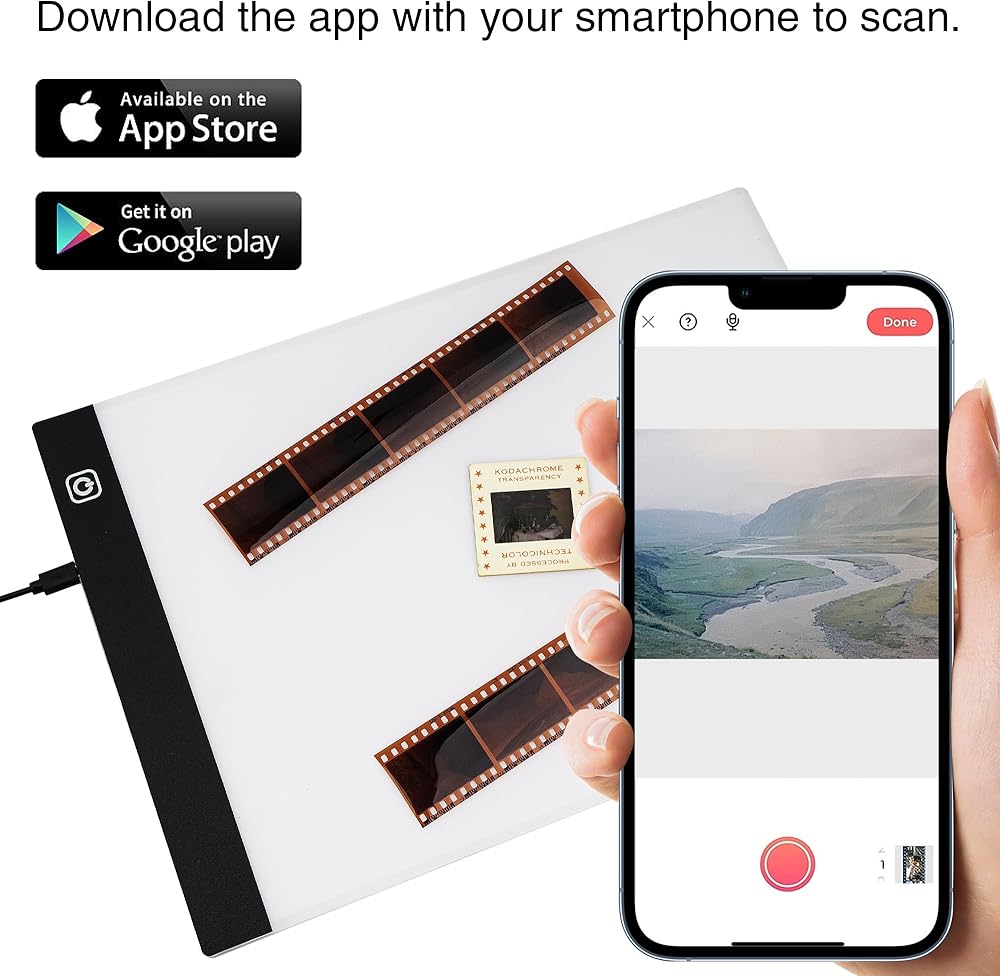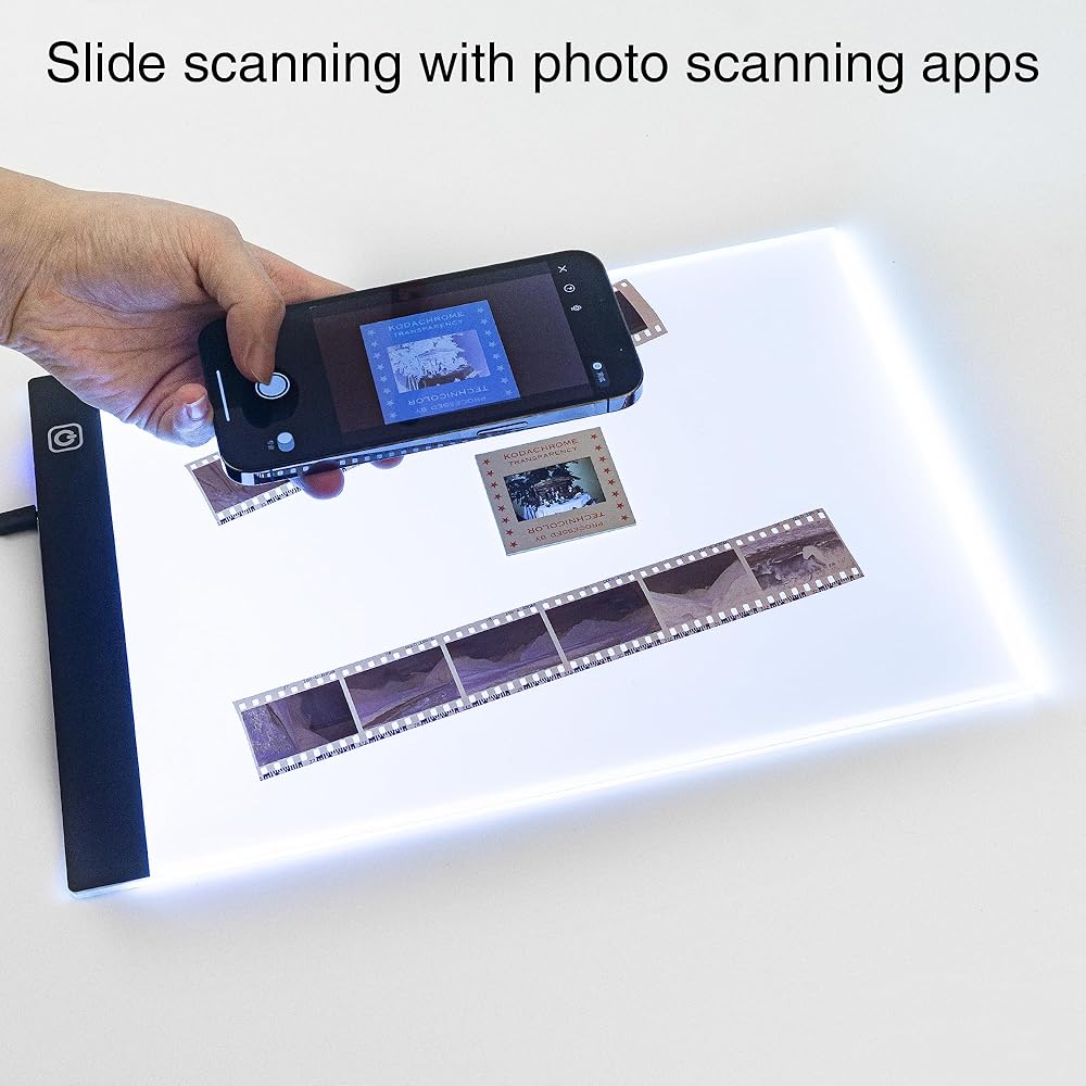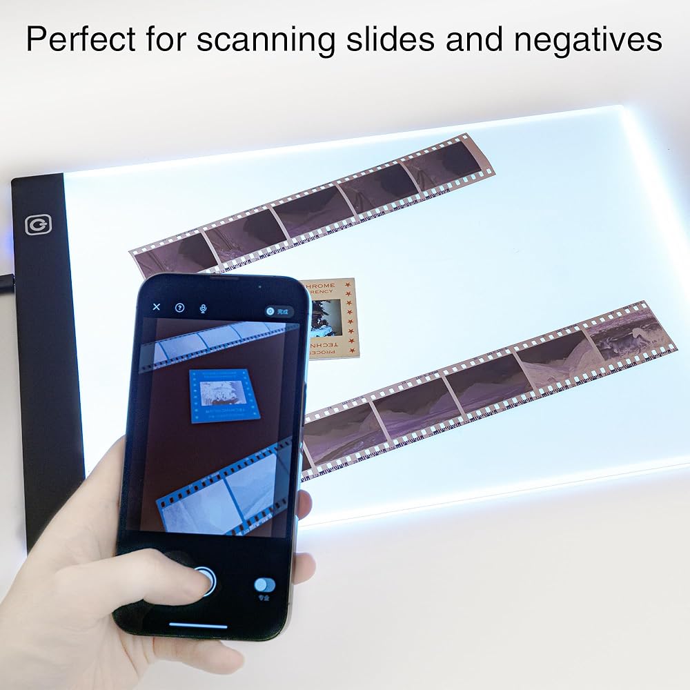 • لوحة إضاءة عارض الشرائح: عارض الشرائح بلوحة إضاءة LED، حجم A4، يمكنك مسح العديد من الصور والشرائح والإيجابيات والسلبيات في وقت واحد باستخدام هاتفك، وحفظها وتحميلها على أي وسائط اجتماعية.