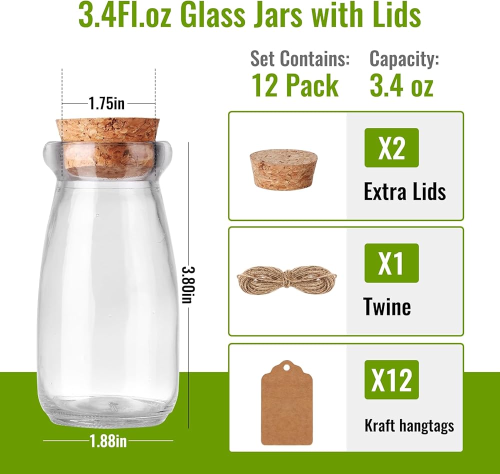 تشتمل مجموعة البرطمانات على: زجاجات زجاجية سعة 3.4 أونصة (100 مل) مع أغطية من الفلين 12 قطعة، وغطاءين إضافيين من الفلين، و12 بطاقة وحزمة من الخيوط بطول ثمانية أمتار؛ الحجم مثالي للأعشاب والمستخلصات