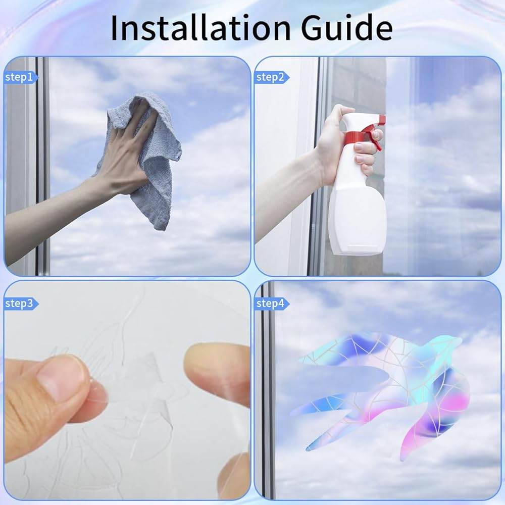 Simply spray a mist of water on the glass, Anti-bump glass stickers glass sticker off the plastic film and apply the smooth side to the glass. These Anti-bump glass stickers are transparent before installation and will reflect colours in the sunlight once installed, creating a rainbow of colours in the room.