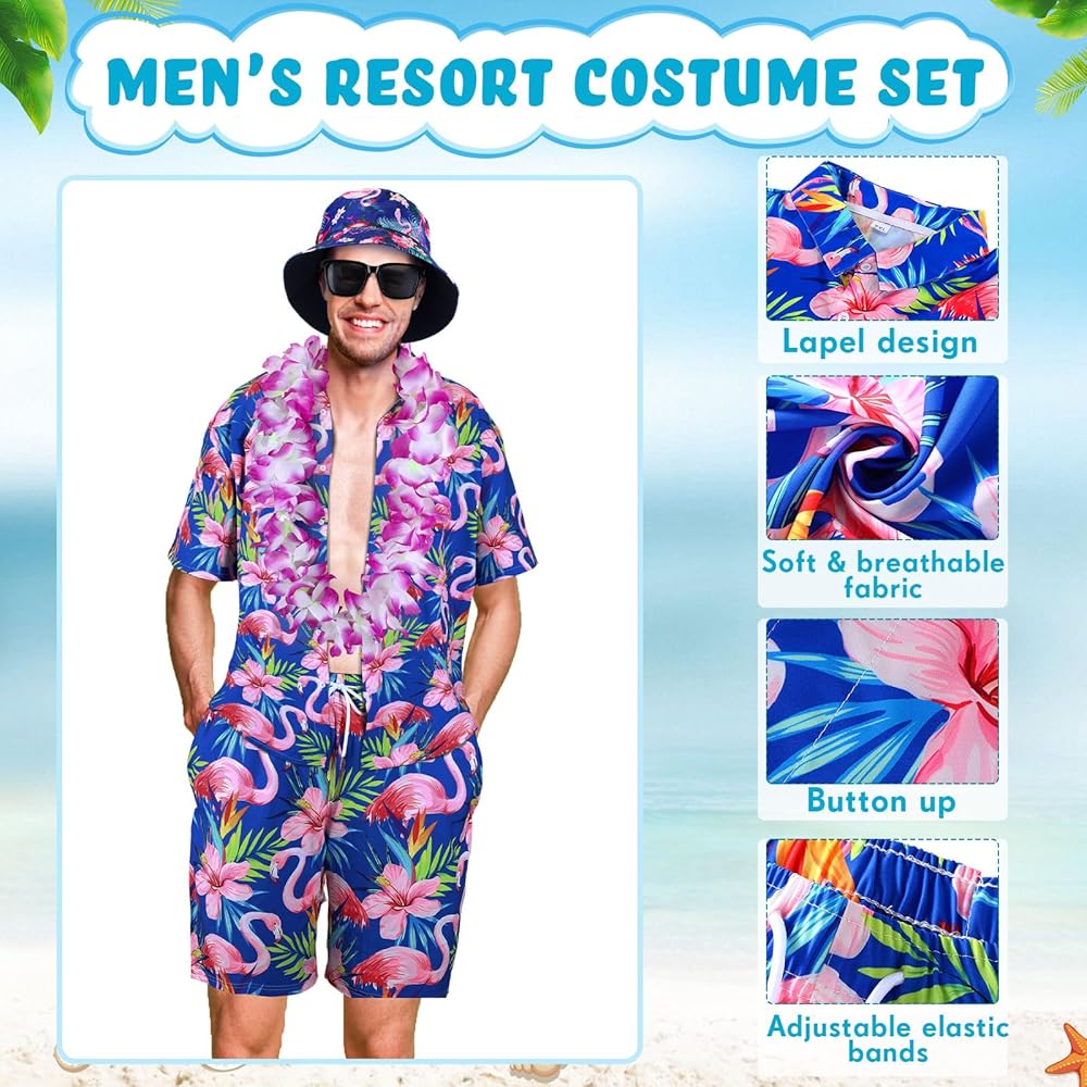 تتضمن العبوة الشاملة: سوف تحصل على مجموعة إكسسوارات هاواي للرجال، بما في ذلك قميص كاجوال قصير الأكمام، وزوج واحد من السراويل القصيرة، وقبعة دلو واحدة، وزوج واحد من النظارات الشمسية، وقلادة واحدة على شكل زهرة، وعصابة رأس واحدة، وسوارين على شكل زهرة؛ تضمن مجموعة البدلات الرياضية الكاملة هذه أن العملاء لن يحتاجوا إلى التسوق في مكان آخر للحصول على إكسسوارات مطابقة، مما يوفر لهم احتياجاتهم من الملابس التي تحمل طابع هاواي