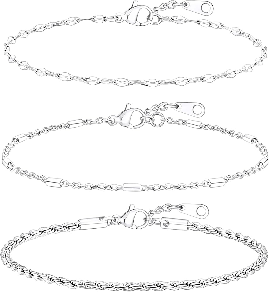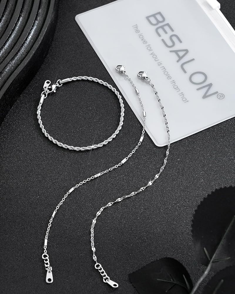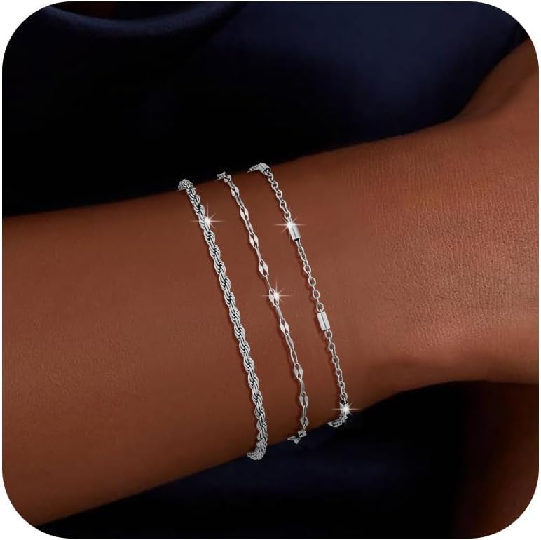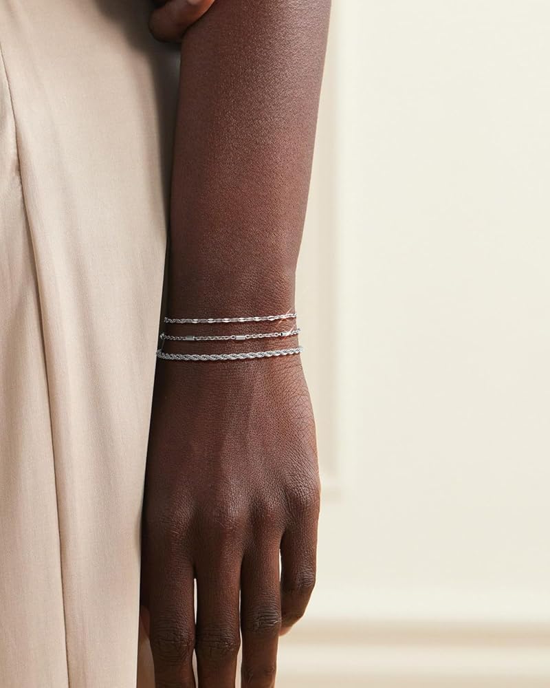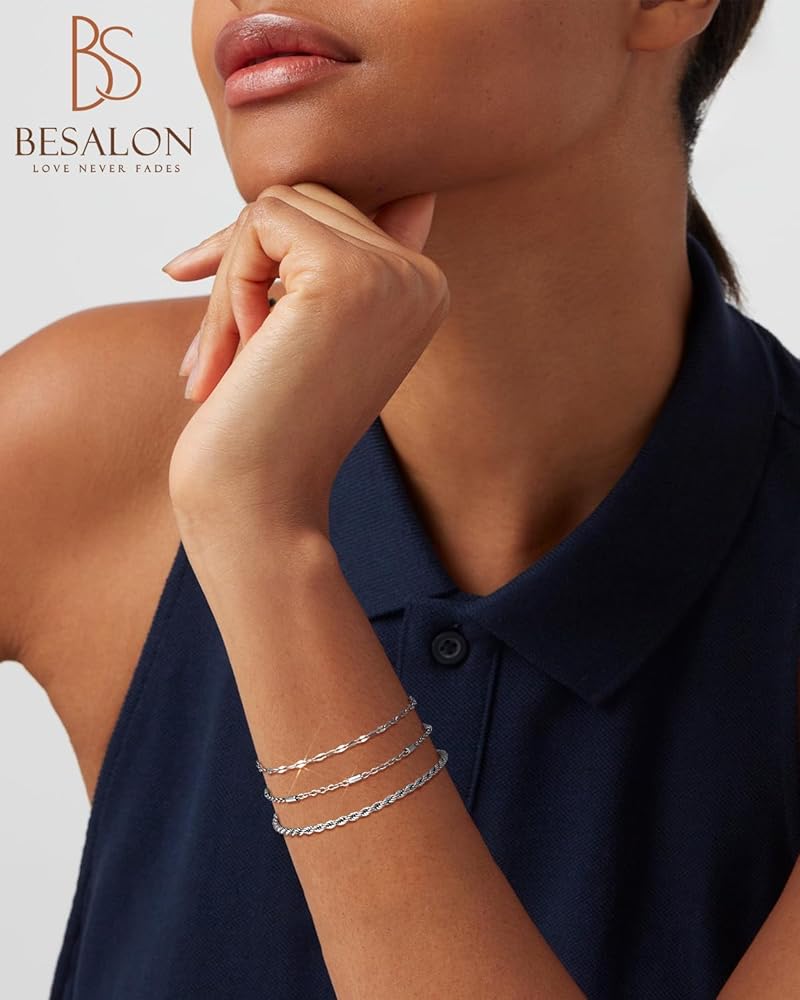 أساور فضية أنيقة للنساء: مجموعة أساور بيسالون المكونة من 3 قطع من الذهب الأبيض تتضمن سلسلة أقمار صناعية مشهورة، وسوار سلسلة كوبية كلاسيكية، وأساور أولية لطيفة بأحرف A-Z. يمكن ارتداء كل سوار من السلسلة الفضية بشكل منفصل أو ارتداؤهما معًا، أو مع أساور أخرى متعددة الطبقات لخلق أسلوبهما الخاص.