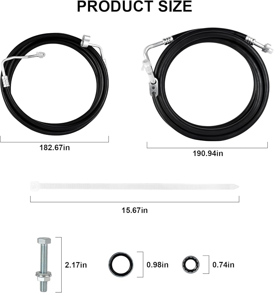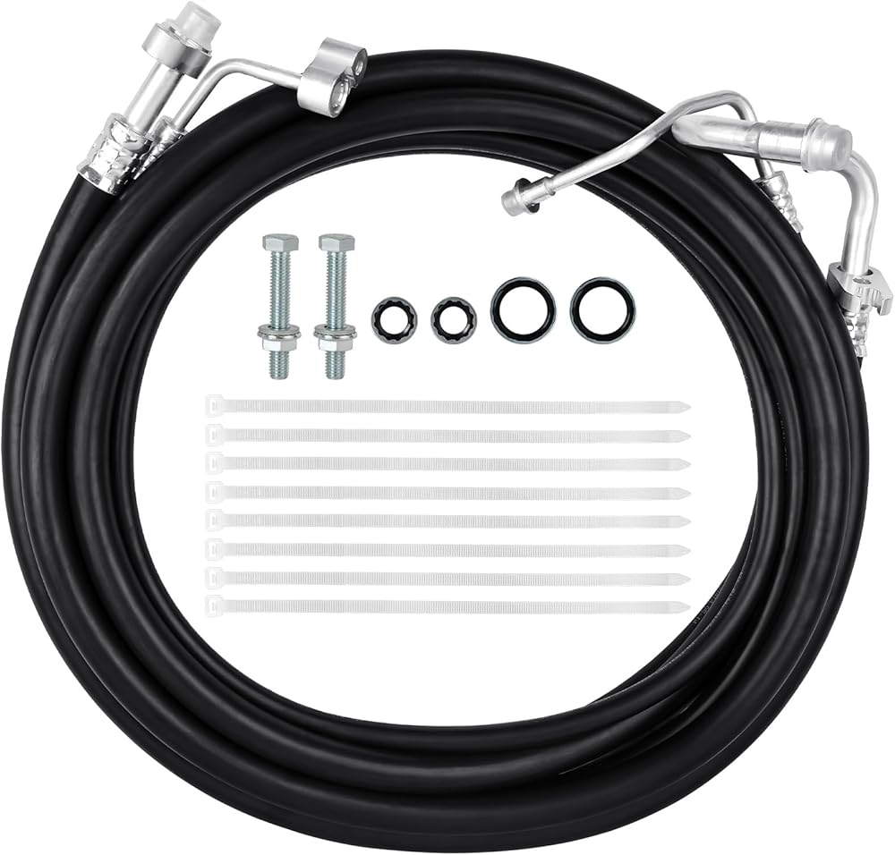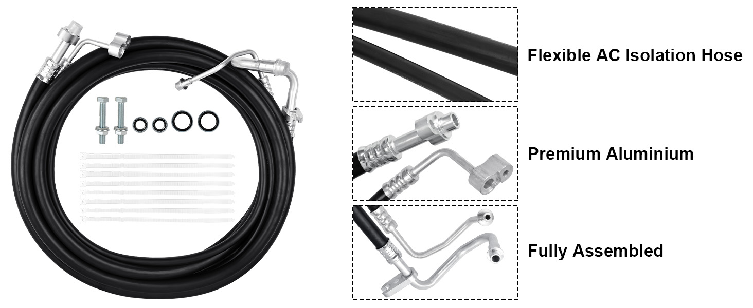 【تشمل العبوة】مجموعة خراطيم تيار متردد كاملة الطول. بما في ذلك 1x خط ضغط عالي خلفي كامل الطول، 1x خط ضغط منخفض خلفي كامل الطول، وصواميل، وفواصل، ومسامير وأربطة بسحاب.