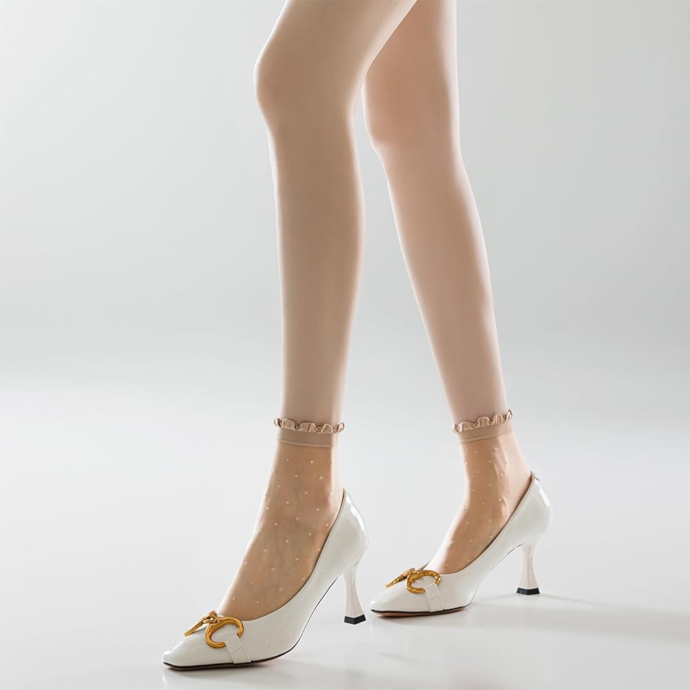 تصميم مكشكش ومنقط: الجوارب الشفافة للسيدات تتميز بتصميم مكشكش فريد، مع نقاط، لطيفة وفريدة من نوعها. يمكن للجوارب المصنوعة من النايلون أن تزين أسلوبك وأزياءك المختلفة.