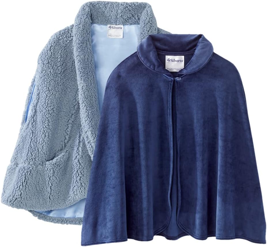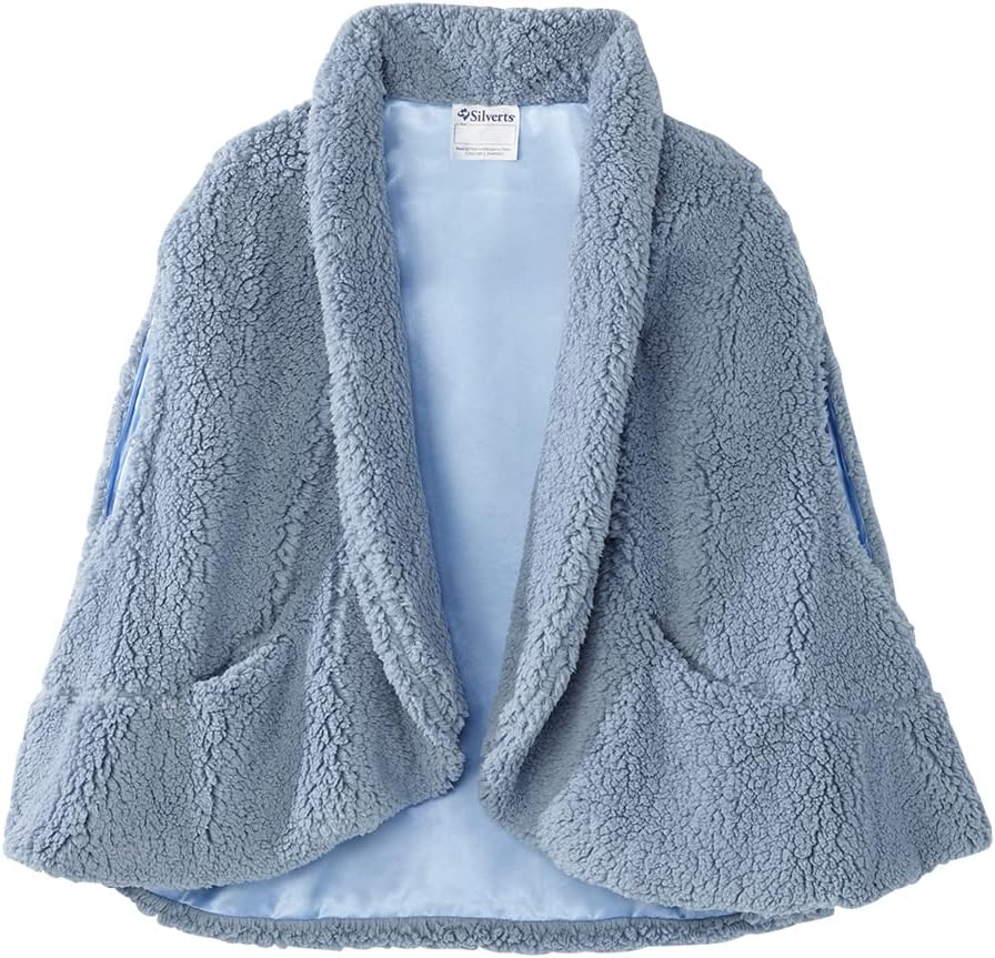 BED JACKET CAPE: Womens Bed Jacket Capes, beautifully designed to hug your shoulders with warmth. Fastens with a stylish button. Quality Polar Fleece Womens Bed Jackets. This fleece bedjacket capes for women is terrific for lounging in bed and a great alternative to robes. Makes a great gift addition for those wearing a cotton or flannel open back nightgown or regular nightgown for women. These capes for women are great for extra warmth for bedridden patients, a bed bound patient, rehabilitation care, skilled nursing facility, nursing care, home care and upper arm paralysis. This womens bed jacket capes by Silverts is a great sleepwear addition to anyone's wardrobe and accessories. SHAWL: Senior Women's Ultra Plush Shawl makes a warm and wonderful gift for your loved one. This shawl is a great stylish alternative to cardigans whether inside or outside. This shawl is Ideal for those with limited arm dexterity and features two convenient pockets to store your belongings. This shawl is made of a super plush sherpa fabric with a delicate satin lining for a touch of luxury.
