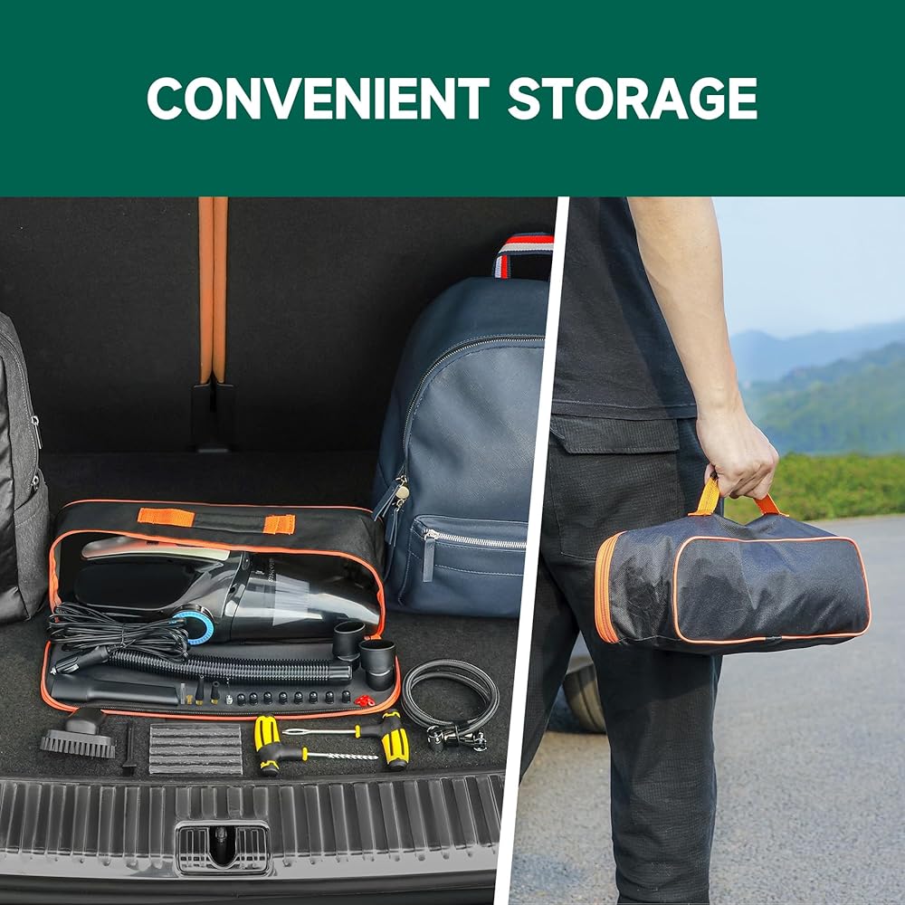 • **𝐋𝐎𝐍𝐆 𝐂𝐎𝐑𝐃 & 𝐋𝐄𝐃** - باستخدام سلك طاقة بطول 14.1 قدمًا، يمكنك بسهولة تنظيف كل منطقة يصعب الوصول إليها في سيارتك والاتصال بكل من الإطارات الأمامية والخلفية للنفخ. يساعدك ضوء LED المدمج على التنظيف بالمكنسة الكهربائية في الظلام، مما يسهل العثور على الأوساخ والشعر المخفي. كما أنه يجعل نفخ الإطارات ليلاً أكثر أمانًا وينبه المركبات القريبة.