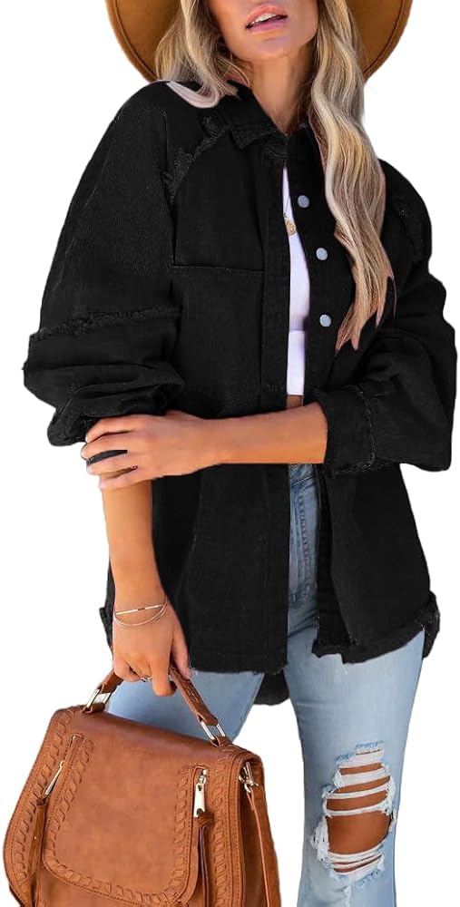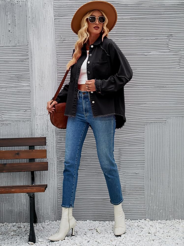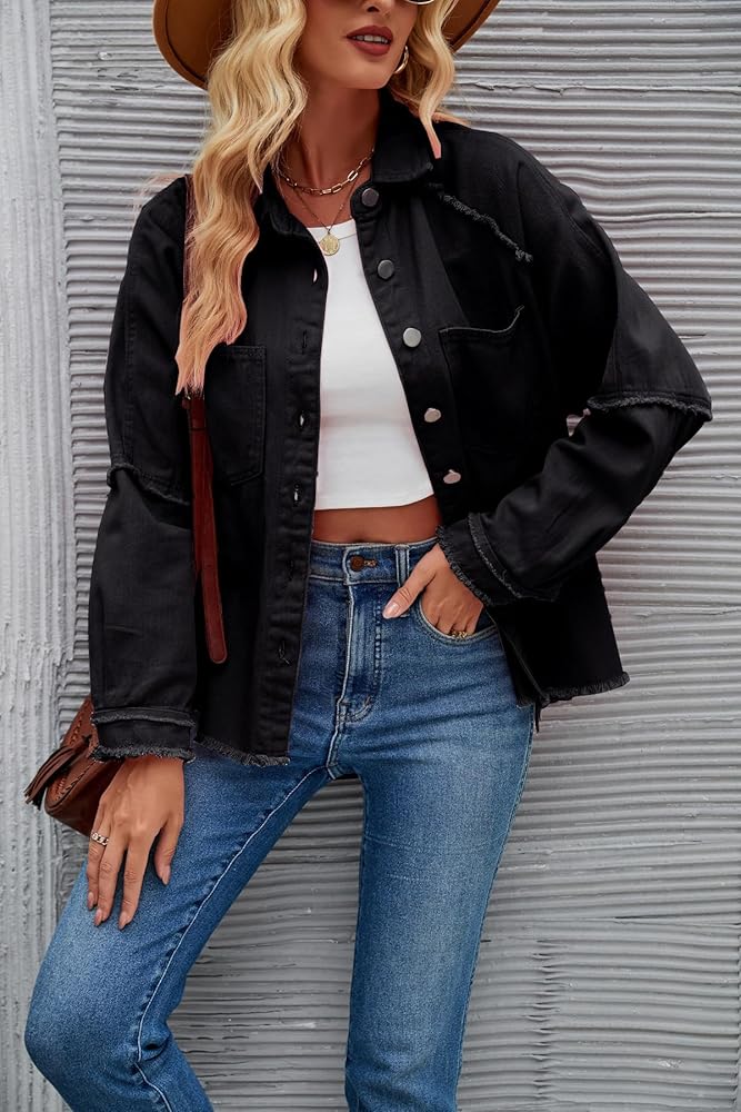 Step up your fashion game with our Women's Lightweight Denim Jacket – a perfect blend of trendy, classic, and retro styles. This long sleeve, button-up shacket features a lapel collar and distressed frayed hem that embodies casual western charm.