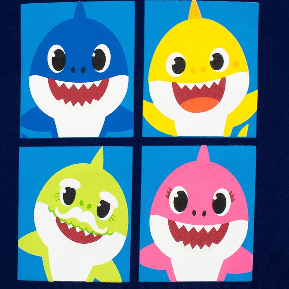 A navy blue pajama top with yellow neckline, showcasing the shark family in a grid, with 'Baby Shark' written above in puff print for a fun texture