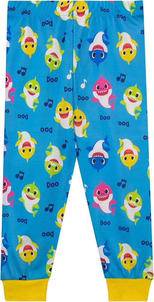 Boys Baby Shark Pajamas. These colourful Baby Shark jammies will have your little shark singing and dancing their way to dreamland! The navy blue pajama top has a yellow neckline and showcases the shark family in a grid, with 'Baby Shark' written above in puff print for a fun texture. The matching blue PJ bottoms feature a repeat pattern of the sharks, music notes and the word 'Doo', with yellow ankle cuffs for extra comfort. The perfect jammies to inspire fun musical dreams!