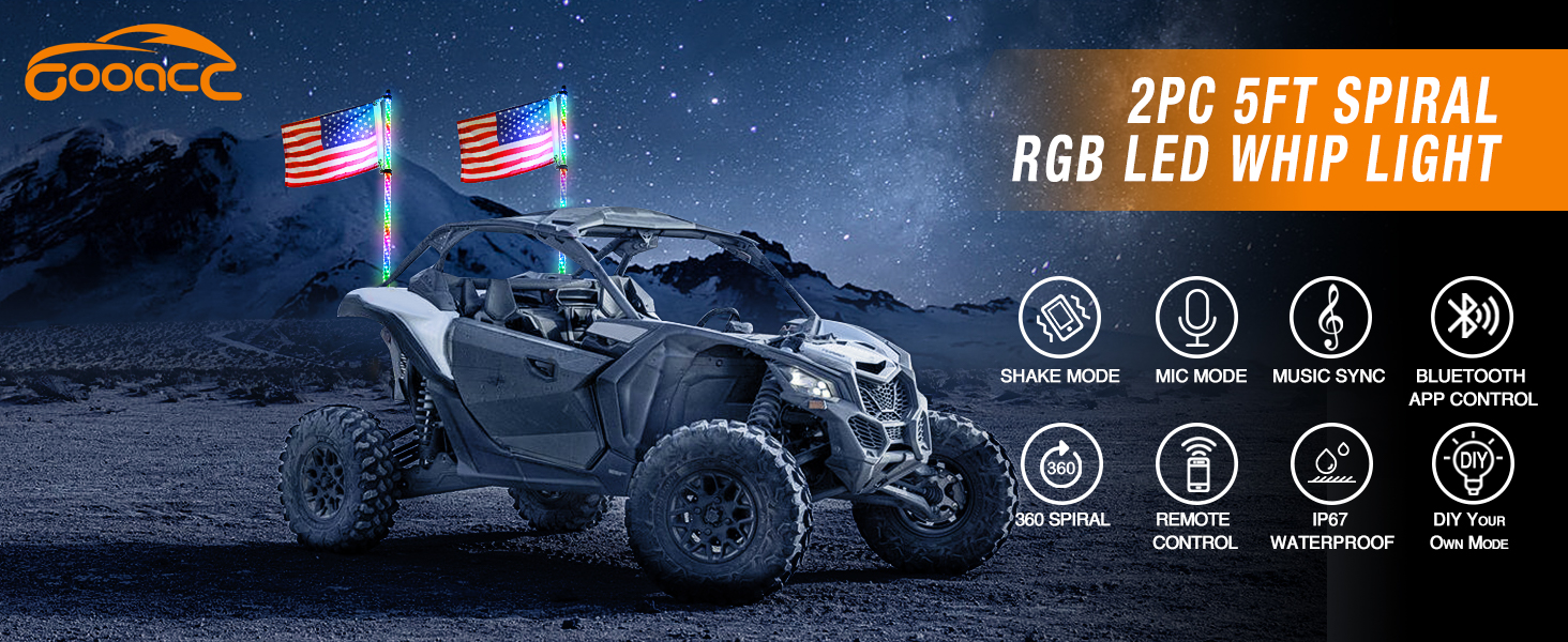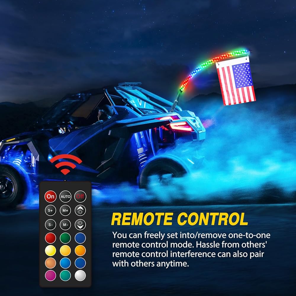 • بلوتوث وجهاز تحكم عن بعد: تحكم مزدوج عن طريق التطبيق وجهاز التحكم عن بعد RF، قم بإضاءة سياطك كما تريد. السوط المضيء غني بالوظائف بما في ذلك التجميع مع أجهزة الأصدقاء، وألوان RGB لا تعد ولا تحصى وخيارات أوضاع المطاردة القابلة للتحرير، ومزامنة مذهلة مع أوضاع الموسيقى والصوت يتحكم
