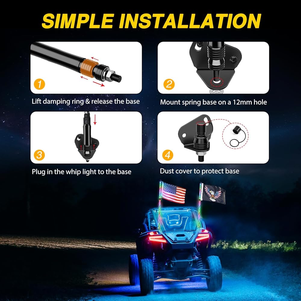 • سهولة التركيب: فقط قم بتحرير القاعدة بسرعة، ثم قم بتركيبها على فتحة 12 مم، ثم قم بتوصيل القاعدة بسرعة باستخدام ضوء السوط. بالنسبة للأسلاك، ما عليك سوى توصيل الأضواء السوطية وتشغيلها باستخدام سلك وحدة التحكم، ثم توصيلها بمفتاح الروك والبطارية. قد تحتاج إلى سلك إضافي في هذا الجزء