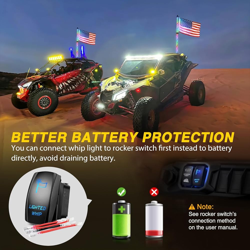 • ضوء إيقاف الدوران العكسي الآمن: تأتي أضواء السوط مع ضوء توقف/فرامل أحمر إضافي، وضوء إشارة الانعطاف الكهرماني، وضوء عكسي/احتياطي أبيض، سوط مضاء جنبًا إلى جنب يضيف أمانًا إضافيًا لقارب UTV ATV Truck Buggy Dune RZR
