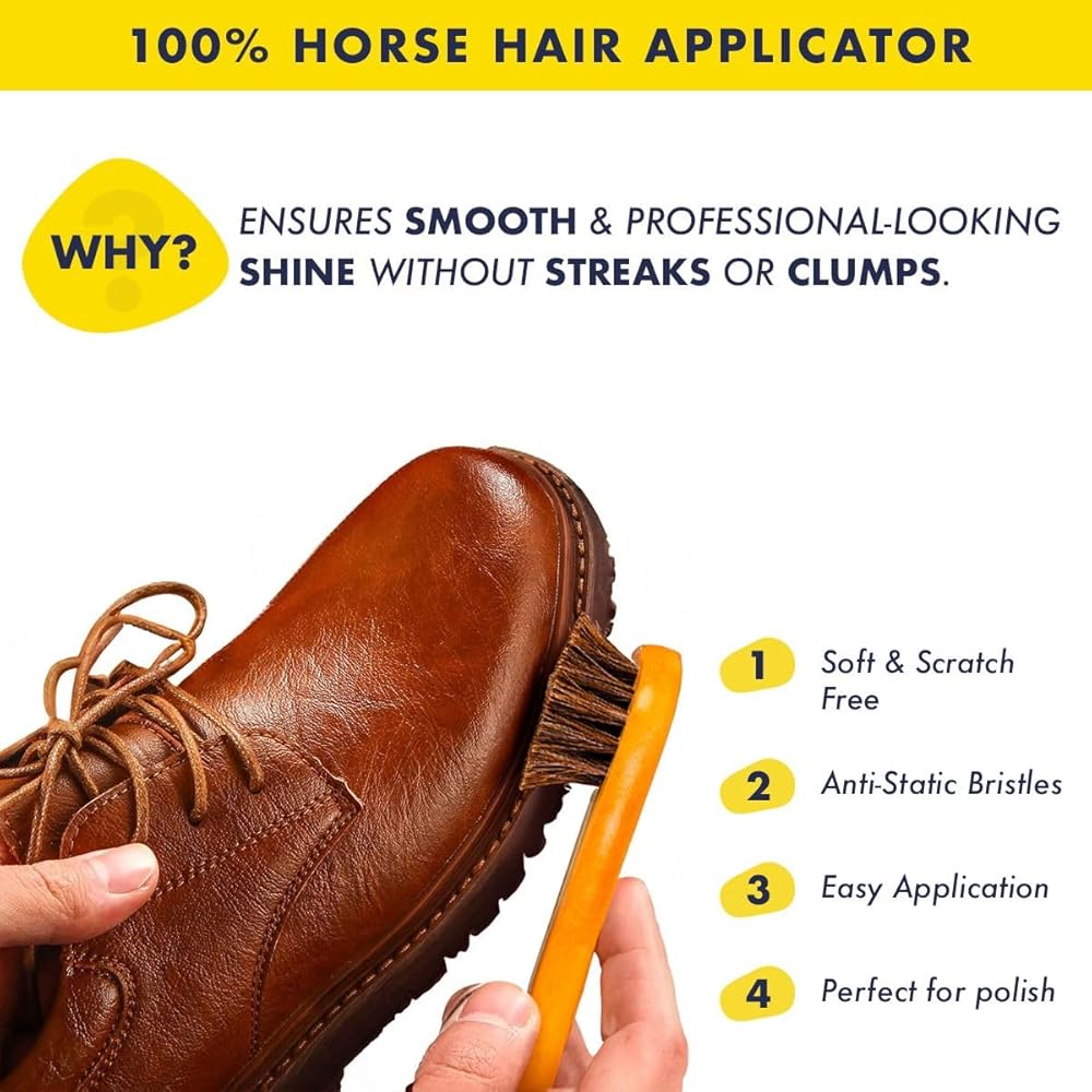 WHATS INCLUDED: Lincoln shoe shine kit Includes premium 3oz full-size black shoe polish for optimal shine and protection, a 5"x20" professional shoe shine cotton cloth for buffing, and a 5" 100% horsehair applicator for precise application.