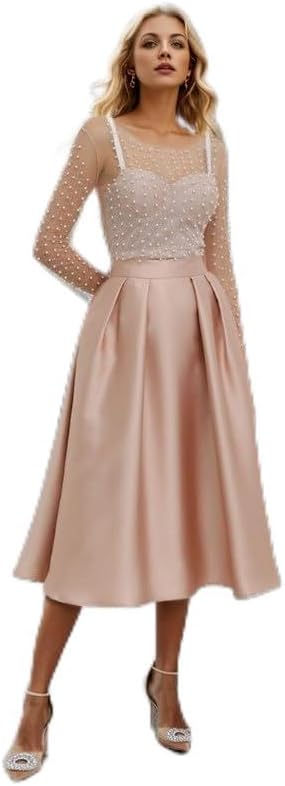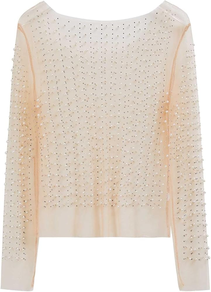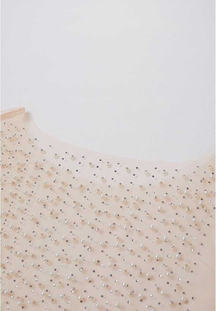 [ Mesh Top Details ] - Faux pearl and rhinestone trimming - Mesh tulle fabric finished - Fabric provides flexibility - Not lined - 100% Polyester - Hand wash cold