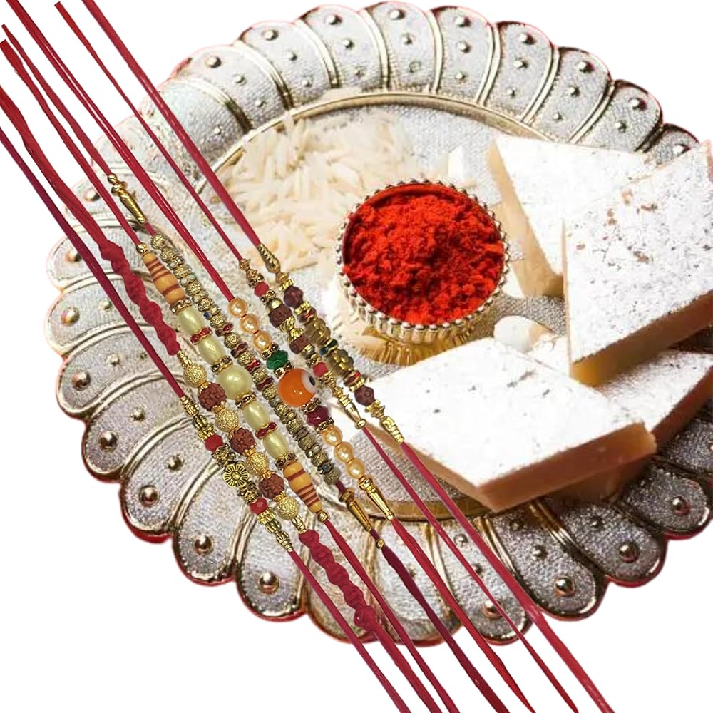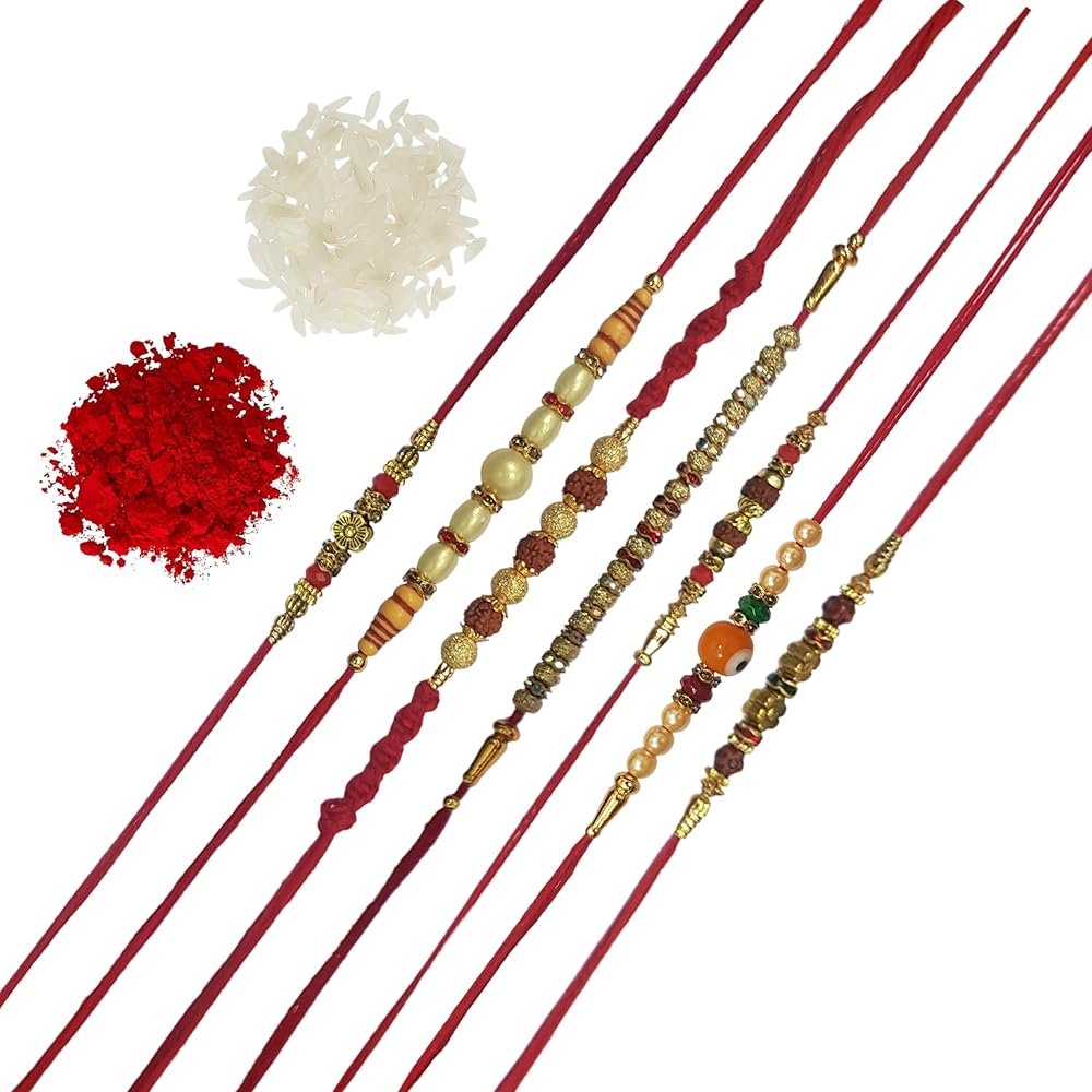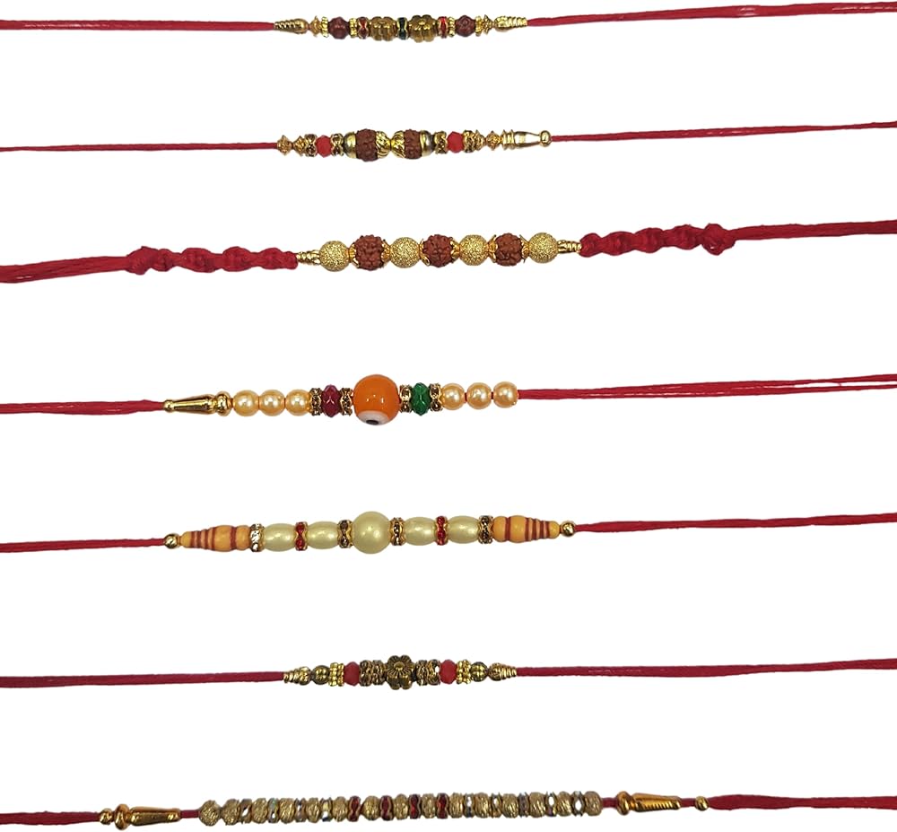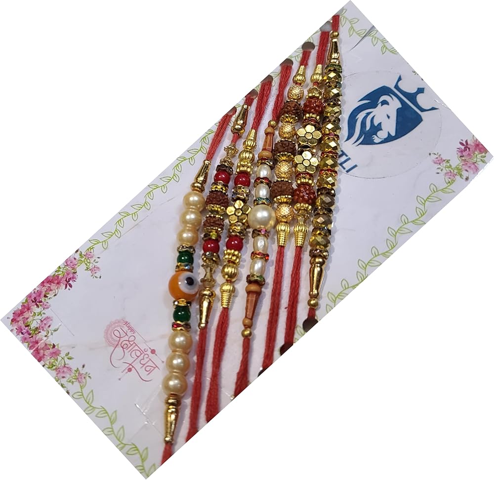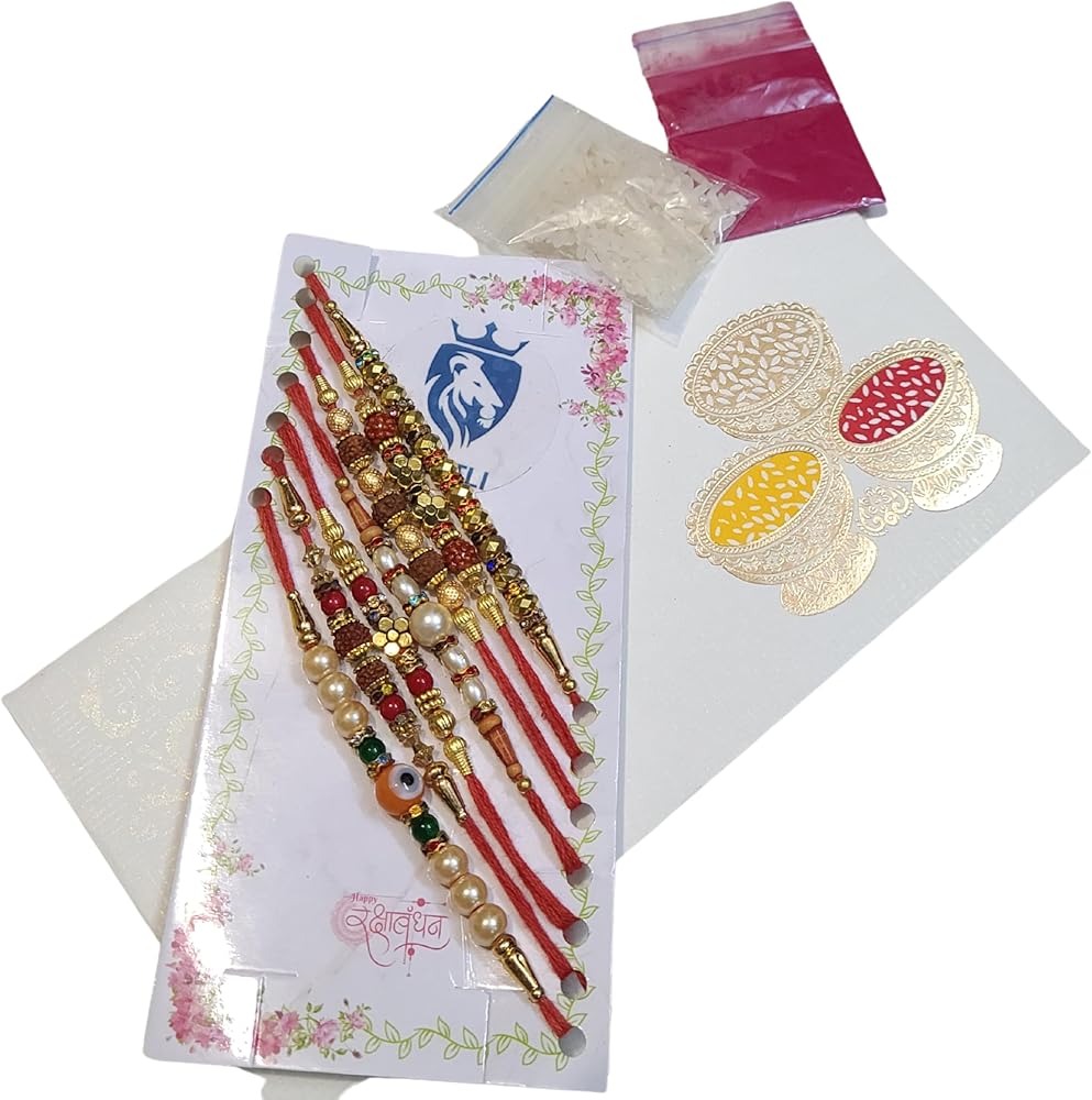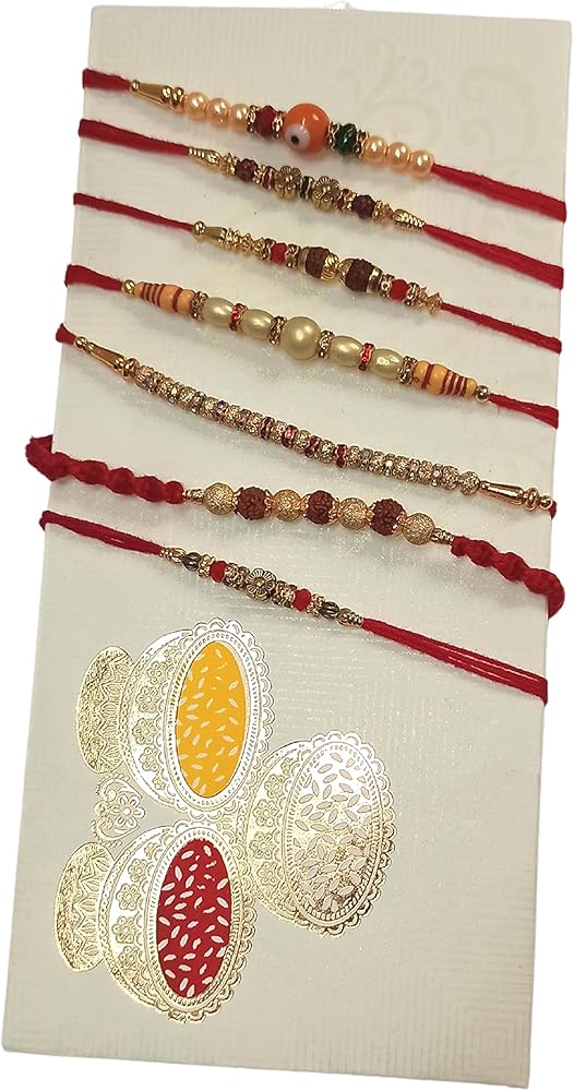 - تحتوي كل عبوة هدايا على 7 راخي تقليدي مصنوع يدويًا لبهايا/بهاتيا، رولي - حقيبة تشاوال - مصنوعة في الهند.