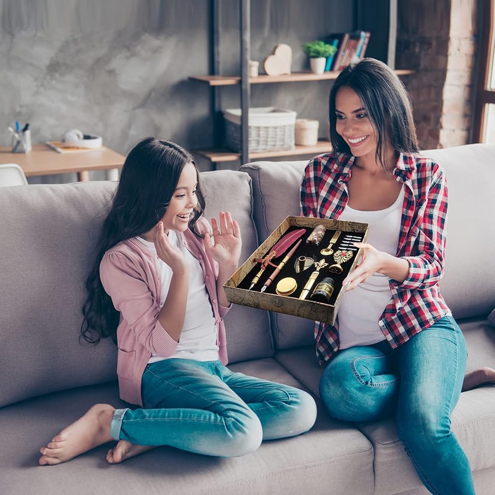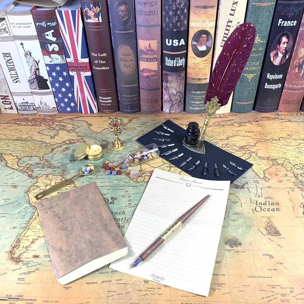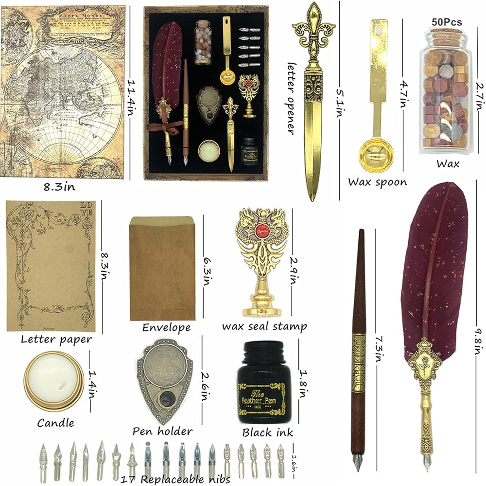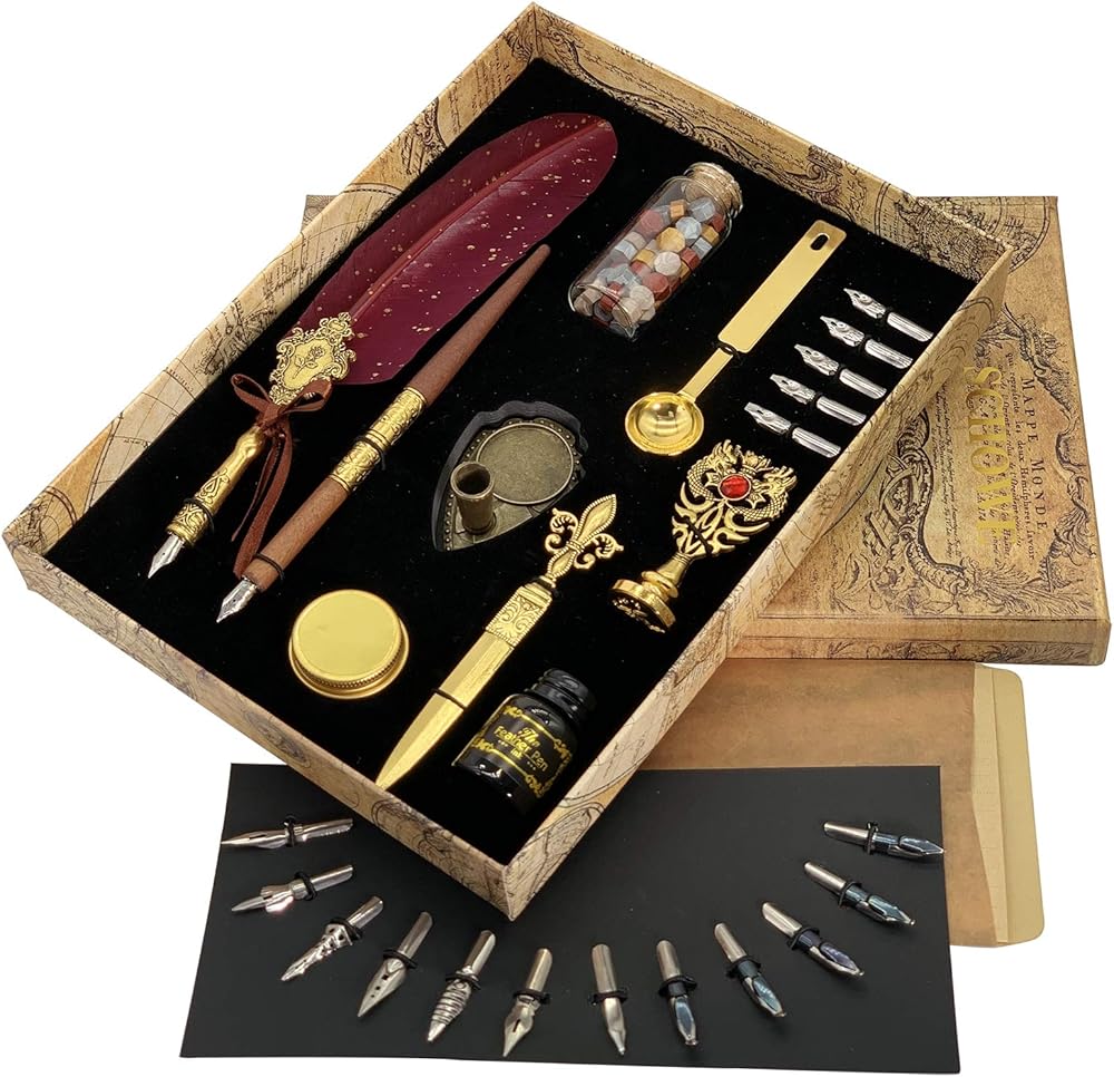 كل ما تحتاجه: الملحقات الكاملة للاستمتاع بتعلم الخط! تحتوي هذه المجموعة الرائعة على 1 قلم ريشة، 1 قلم غمس خشبي، 1 زجاجة حبر أسود، 1 ختم شمع، 1 حامل أقلام، 1 زجاجة شمع، 1 ملعقة شمع، 1 شمعة، 1 ورق رسائل، 1 ظرف، 1 فتاحة رسائل. و5+12 سنًا قابلة للاستبدال، كلها مقدمة في صندوق ذو طراز كلاسيكي، مريحة للاستخدام أثناء الكتابة وسهلة التخزين بعد الاستخدام.