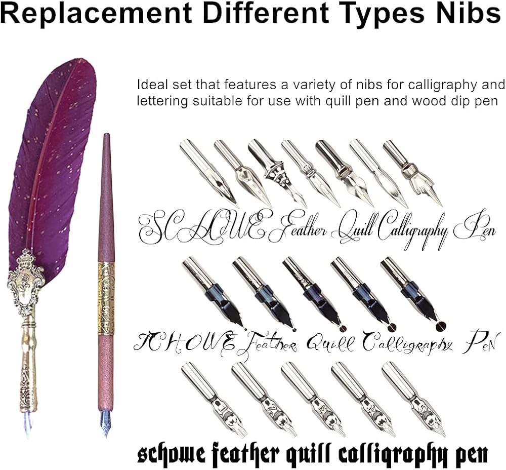 كتابة سلسة: يتميز جسم قلم الريشة بأنه مريح في الإمساك به نظرًا لتصميمه الاصطناعي، مع وجود العديد من الرؤوس الفاخرة ذات الأنماط المختلفة، يمكنك تجربة محرف خط مختلف. والتصميم السائل الخاص للقلم يمكن أن يعزز امتصاص الحبر ويطيل وقت الكتابة، وهو مثالي للاستخدام مع المستندات والبطاقات والحروف والمزيد!