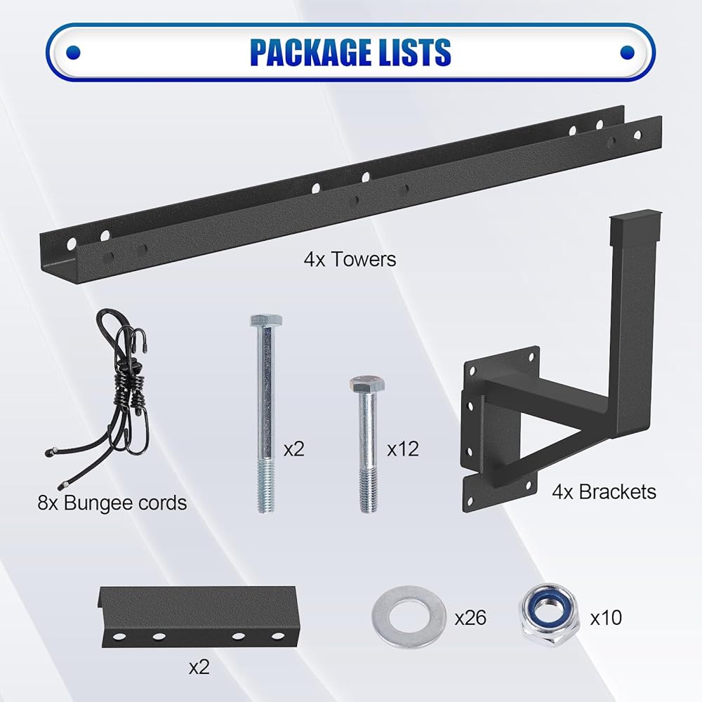 Package Included: 2 towers, 4 brackets, 4 bungee cords 8 screws