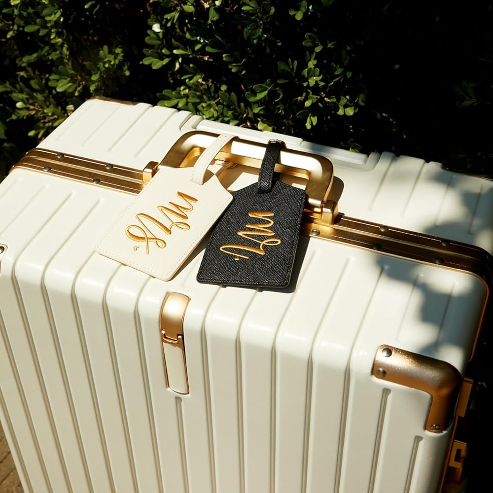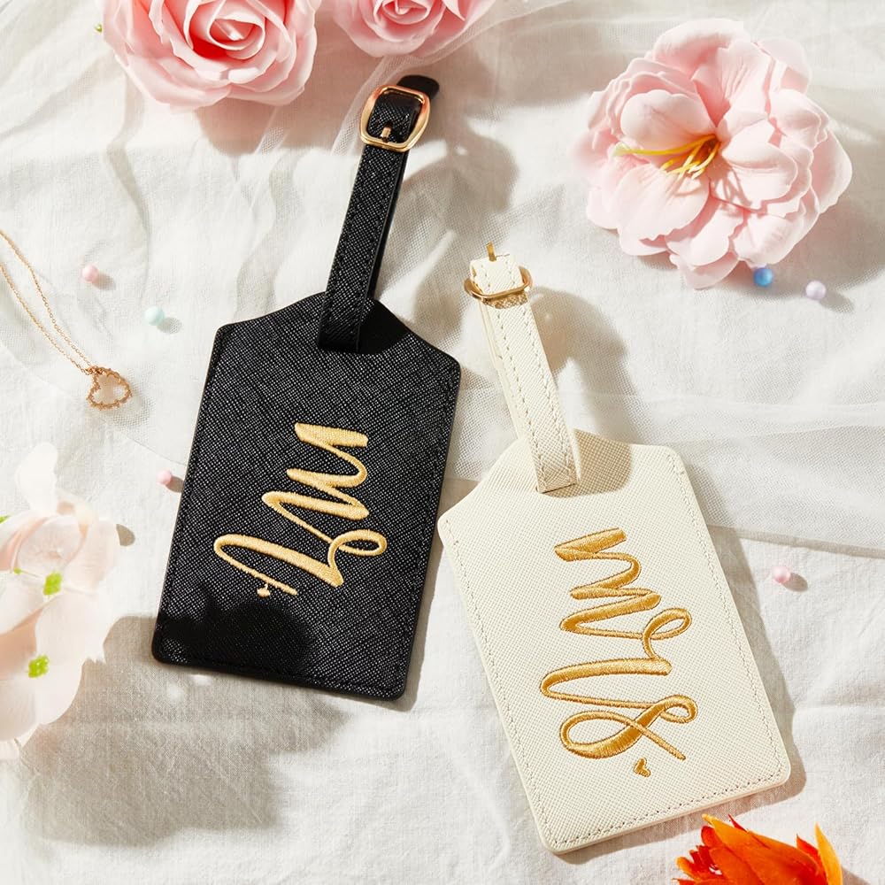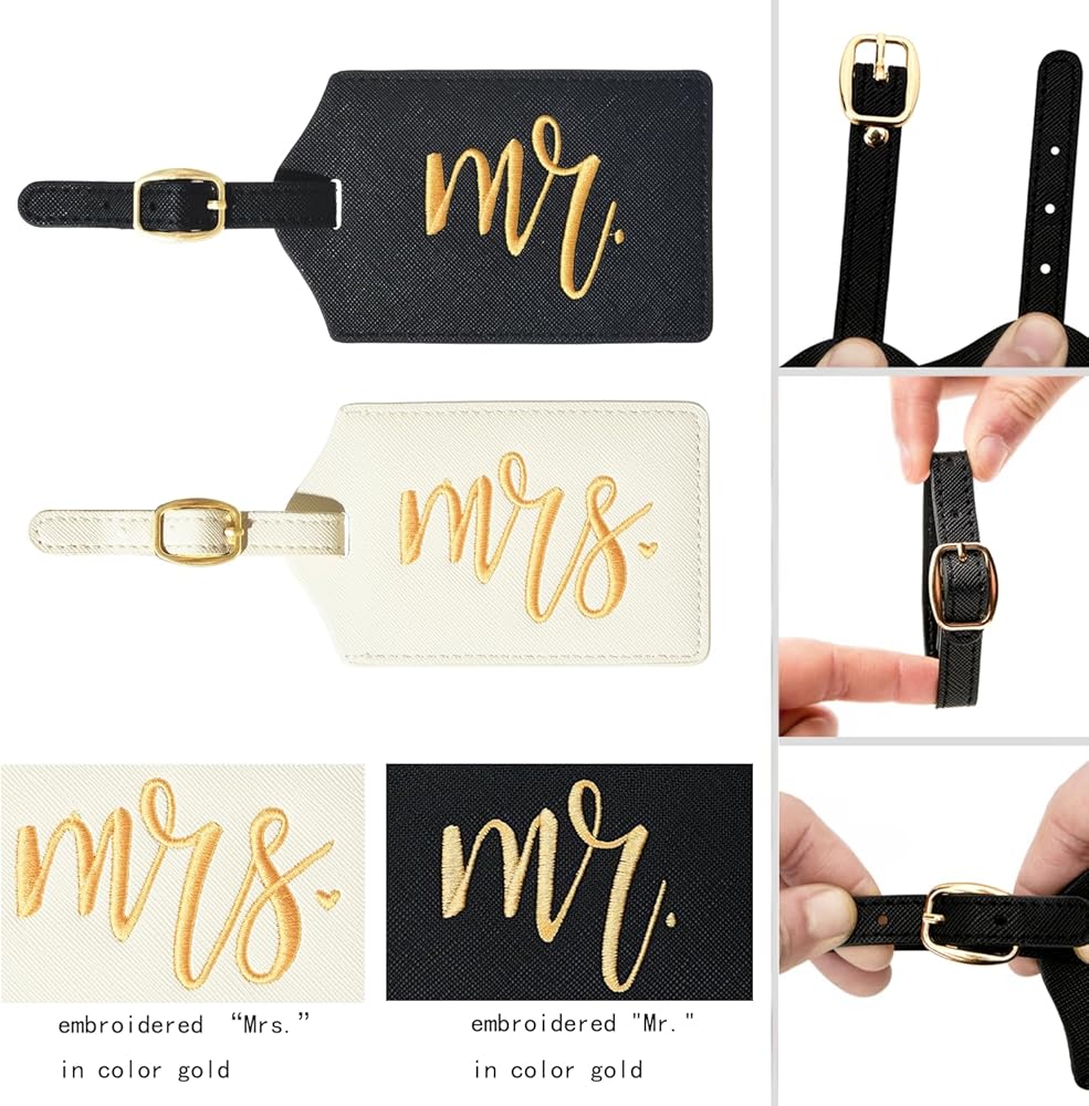 • Premium Quality Material: Our set includes two luggage tags and an Airtag holder made from durable materials. The "Mr." tag comes in a sophisticated black with gold script, while the "Mrs." tag features an elegant white with gold cursive lettering. The Airtag holder is constructed with robust fabric for long-lasting use.