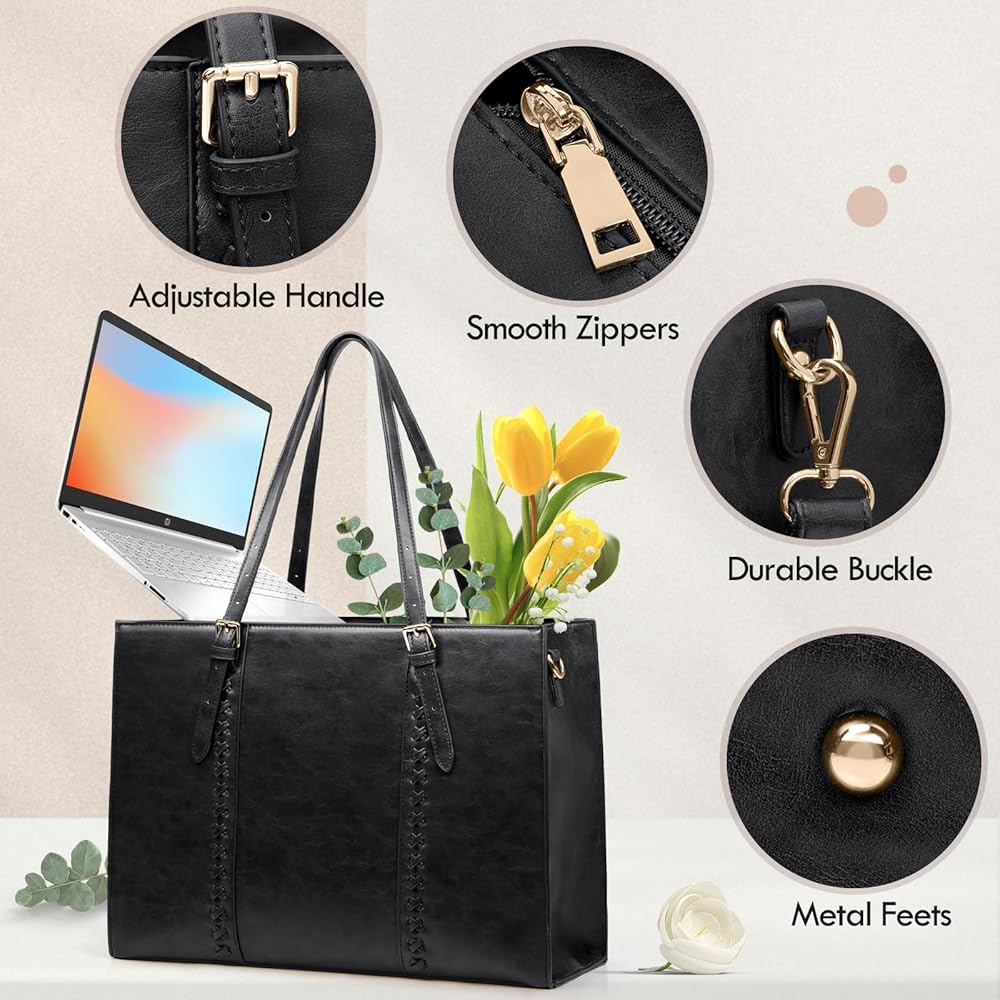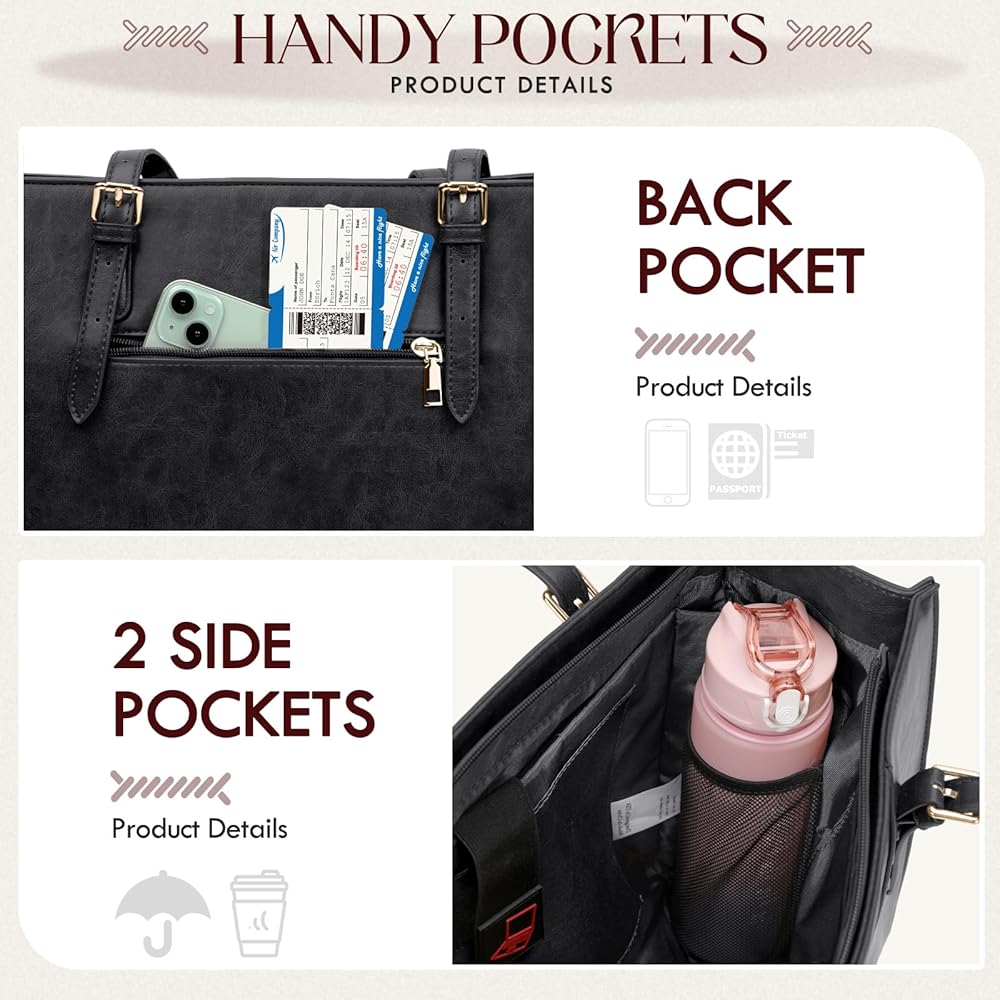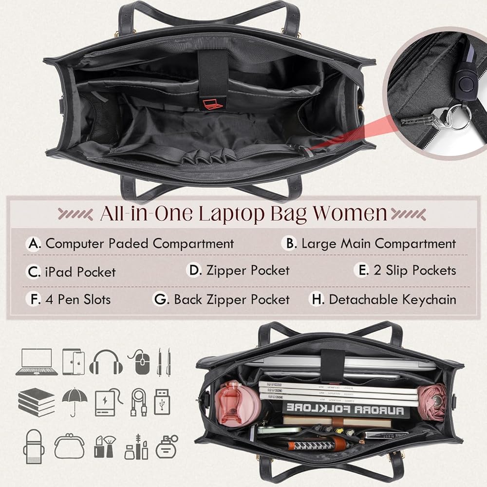 • سهولة الوصول إلى الأساسيات: تتميز حقيبة اليد الكبيرة بجيب رئيسي مبطن للكمبيوتر، وجيب واحد للكمبيوتر اللوحي، وجيبين جانبيين مرنين، وجيبين منزلقين، و3 فتحات للأقلام، وجيب خلفي خارجي بسحاب، وسلسلة مفاتيح قابلة للفصل، بالإضافة إلى الأمان مع سهولة الاستخدام. تسمح البطانة الإسفنجية السميكة داخل حجرة الكمبيوتر لحقيبة الكمبيوتر المحمول النسائية هذه بحماية الكمبيوتر المحمول الخاص بك من الصدمات بشكل أفضل. قل وداعًا للتنقيب في الحقيبة الفوضوية - كل شيء له مكانه في حقيبتنا المصممة بعناية.