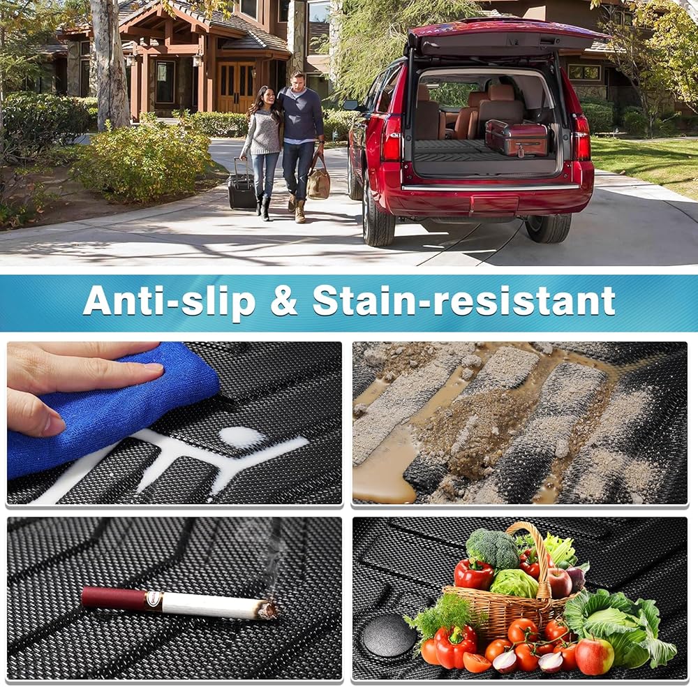 Non-slip and Trap Debris: With a textured non-slip surface and unique channels, this weatherproof cargo liner for Chevy Tahoe can effectively trap sand, water, mud, dirt, rain and muck. You won't have to worry about your luggage scratching or staining the original carpet thanks to the trunk liner.