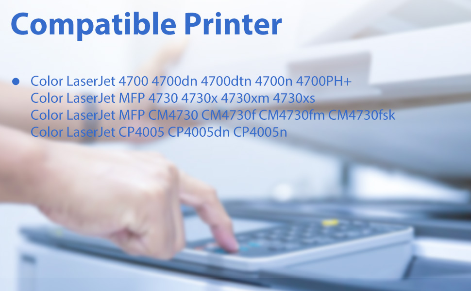 - متوافق مع HP Color LaserJet 4700، 4700dn، 4700dtn، 4700n، 4700ph+، 4730mfp، 4730x mfp، 4730xm mfp، 4730xs mfp، CM4730 MFP، CM4730f MFP، CM4730fm MFP، CM4730f كورونا MFP، CP4005dn، CP4005n