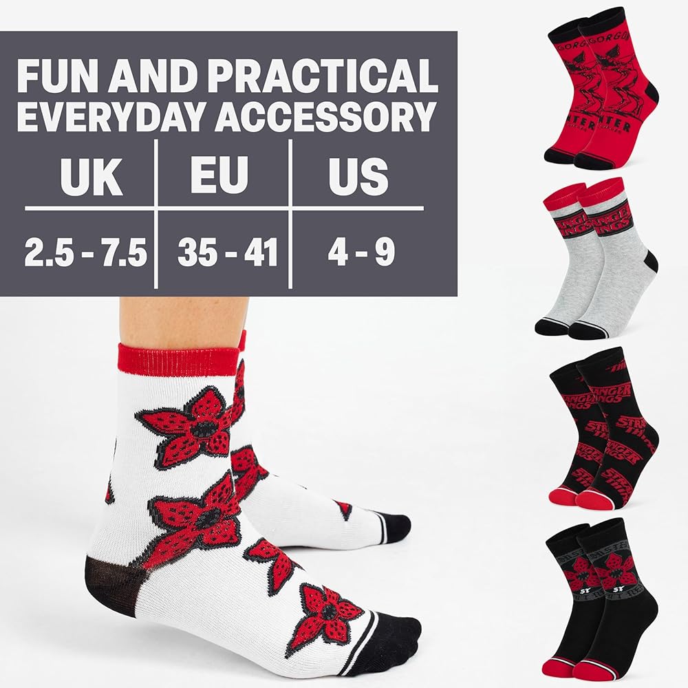 Step into comfort and style with this fun Stranger Things multipack of socks for women and teens. With a range of fun designs to brighten your week and made with soft and breathable material, they'll upgrade your sock drawer instantly! Available in one size (4.5-9.5) see images for more features and details.